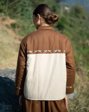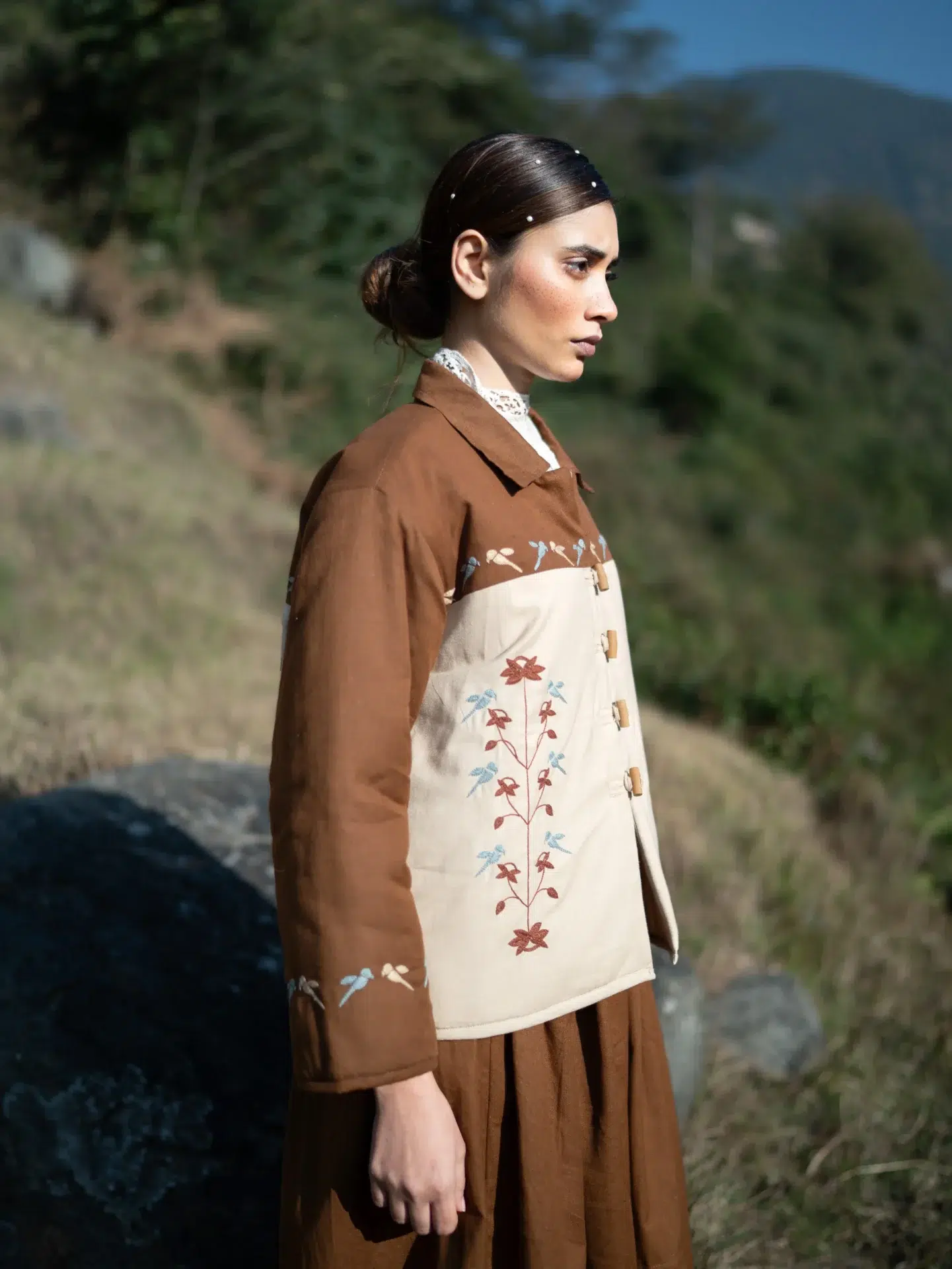 Melora hand-embroidered quilted jacket. It features bird motif hand embroidery work all over the front and back.