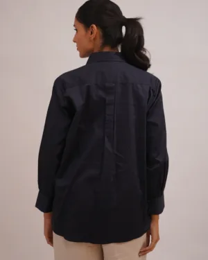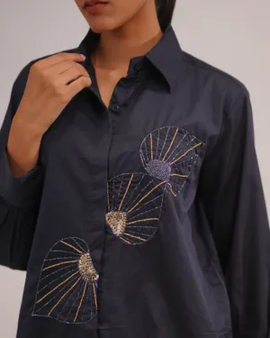 A symphony of sophistication and shimmer.This navy blue shirt captures the essence of quiet luxury with its lustrous finish and intricate thread embroidery inspired by radiant sunbursts. Tailored in a soft satin-cotton blend, it exudes a structured yet fluid silhouette — perfect for modern women who appreciate effortless elegance.