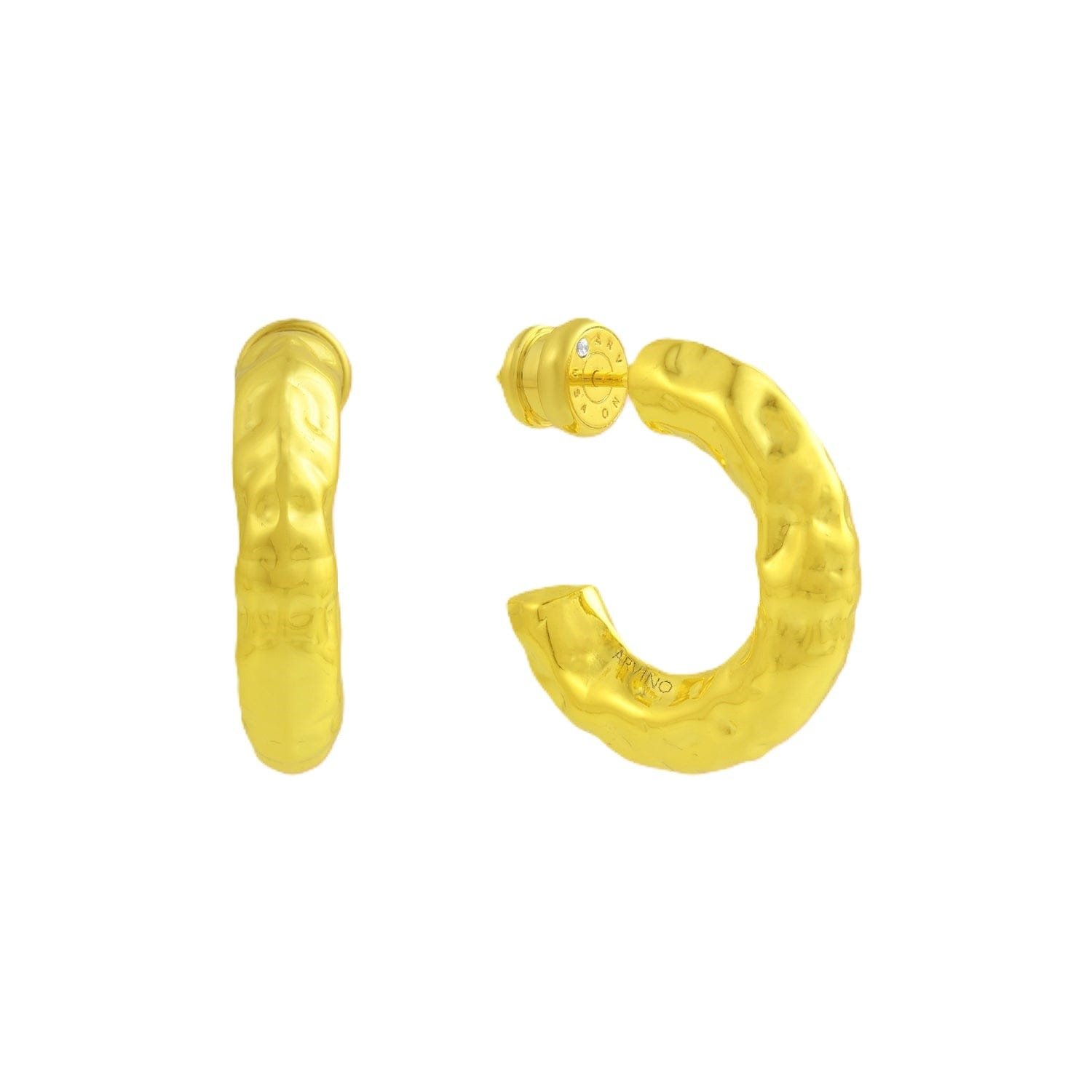Inspired by the rugged textures of ancient fortresses, these hoops feature raw, unfinished surface with intricate etchin
