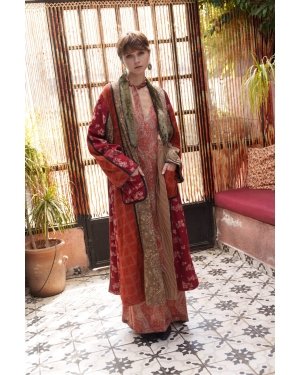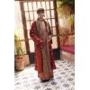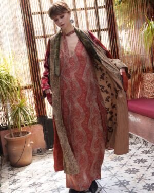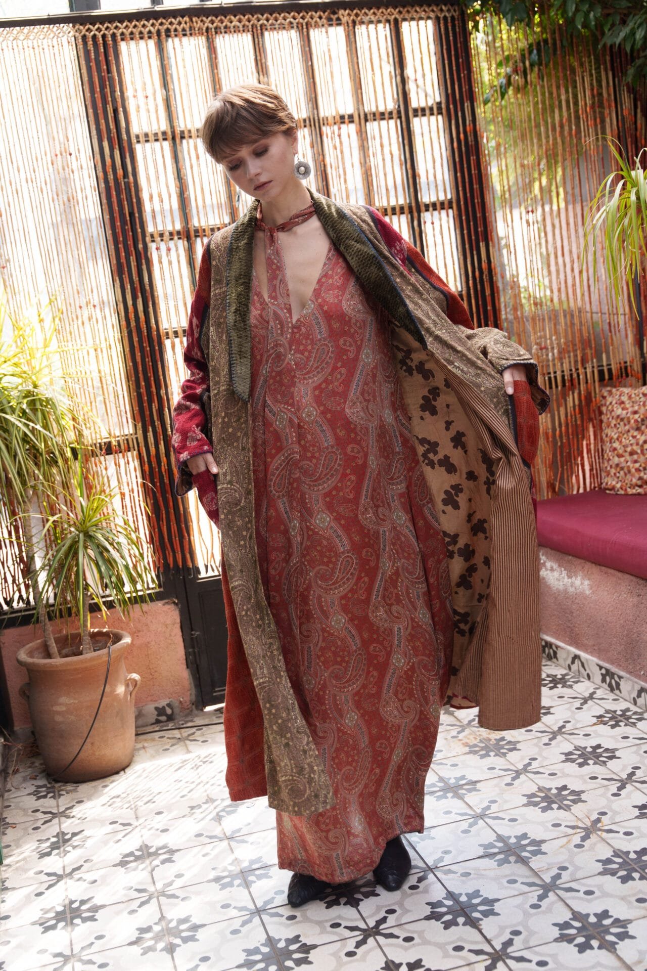 Olive paisley, maroon floral, rust checks printe and all over butterfly embroidered viscose textured color block jacket with velvet quilted collar and blanket stitch detail