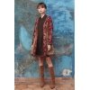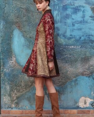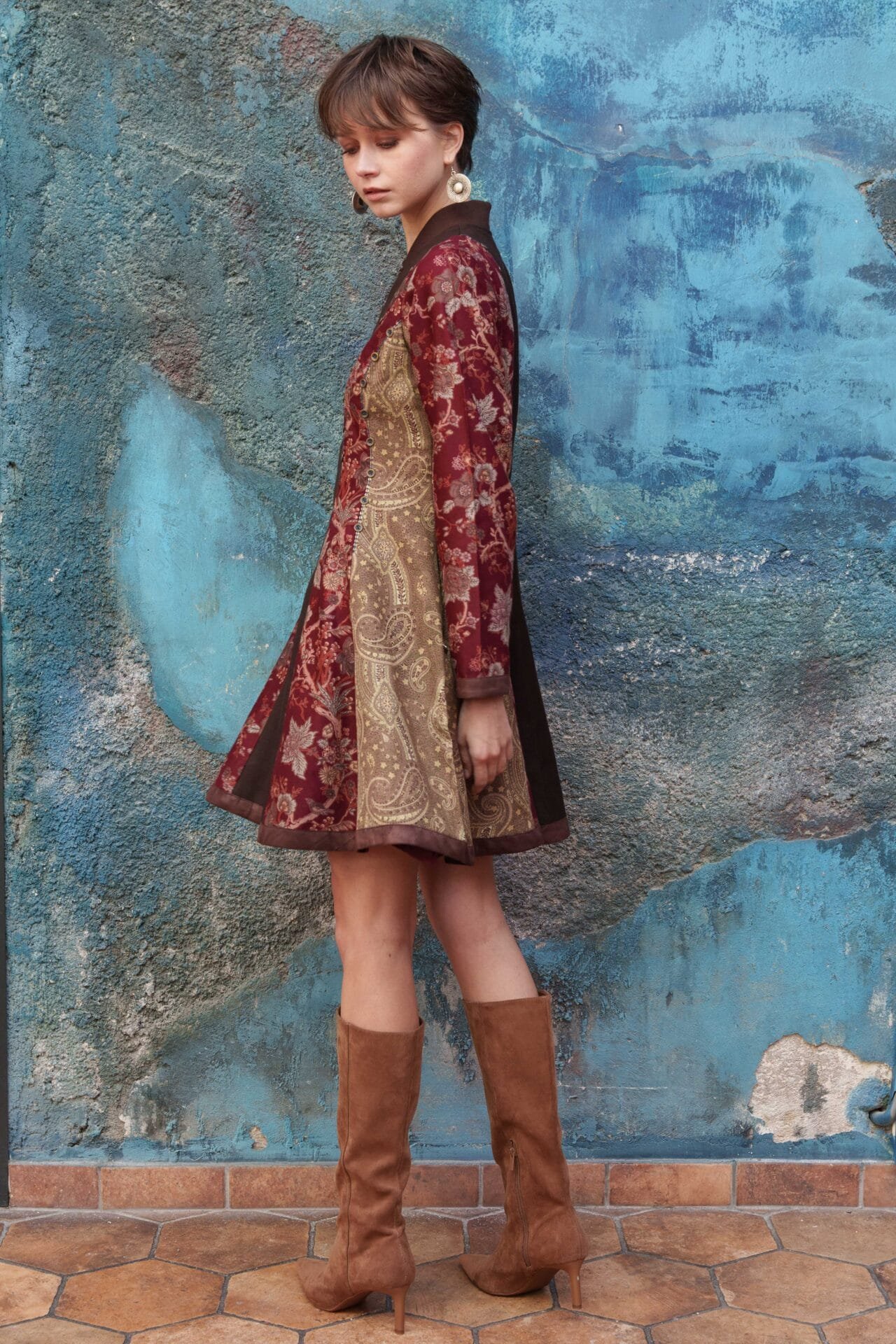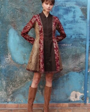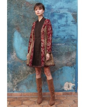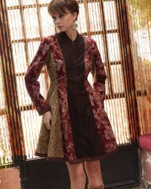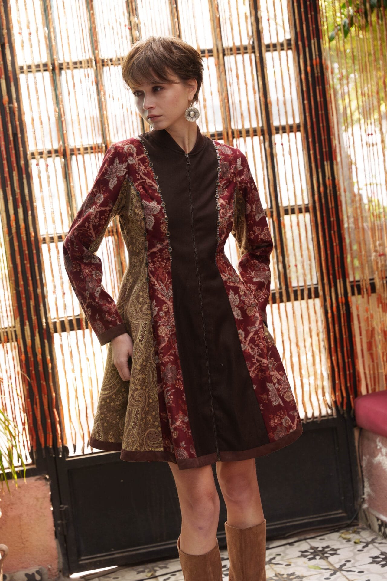 Brown solid, olive paisley and maroon chintz printed front open short dress with suede detail and rib collar