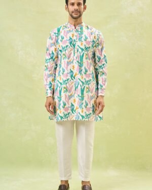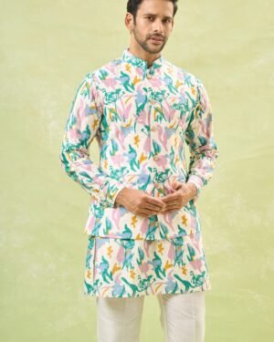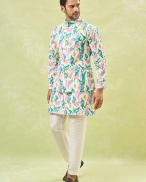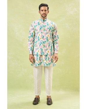 Off White cotton silk based jacket enhanced with colourful paint strokes and self embossing, paired with a matching kurta and an off white dupion silk based pants.