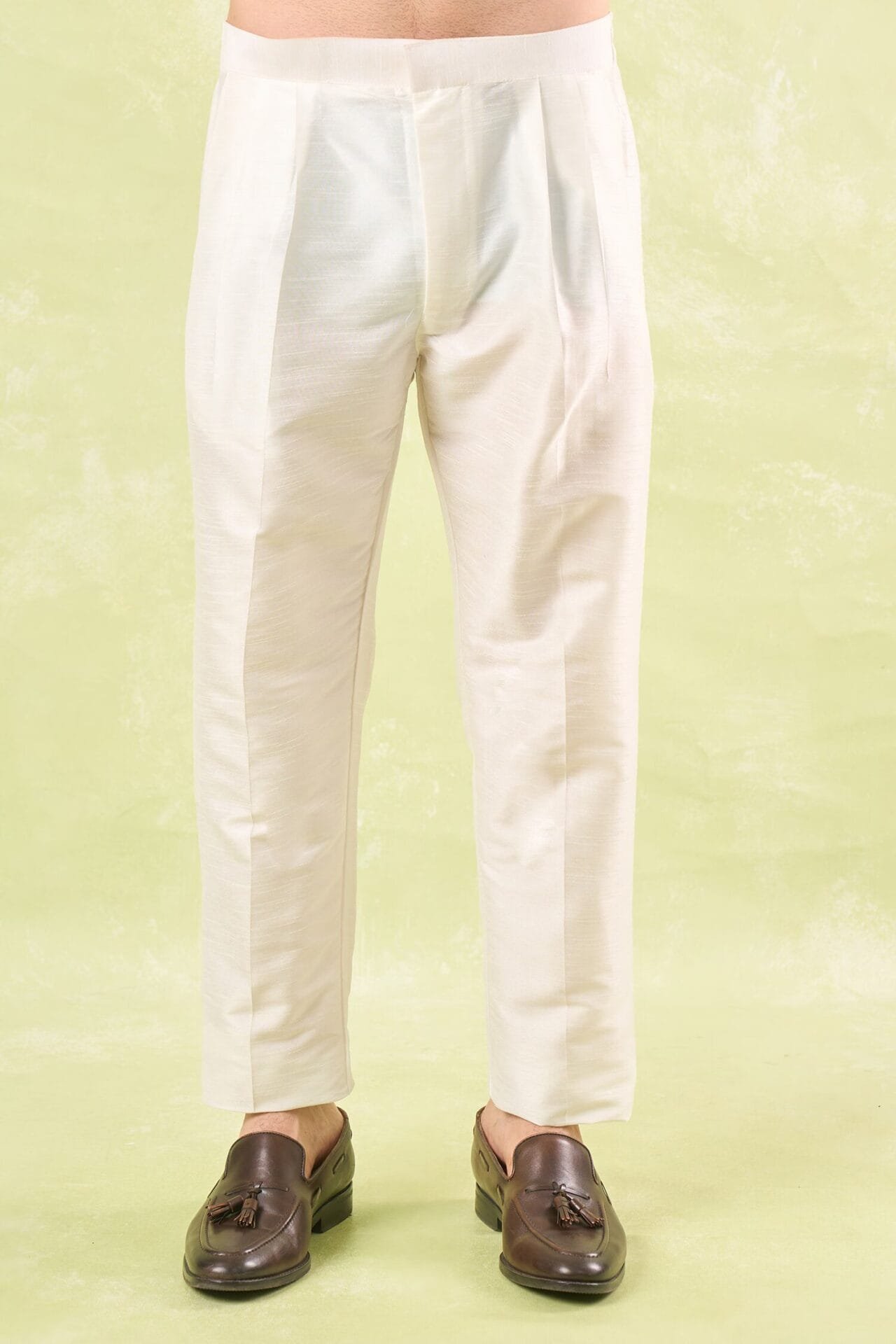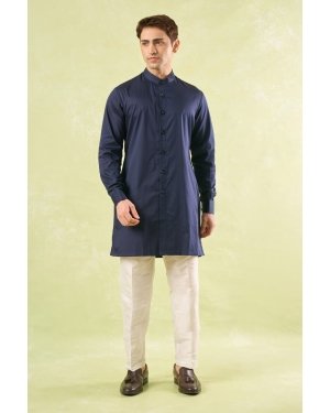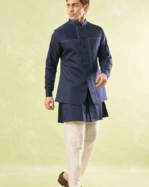 Navy Blue crepe silk based jacket enhanced with running stitch detailing paired with a matching crepe silk based kurta and an off white dupion silk based mexican pants.