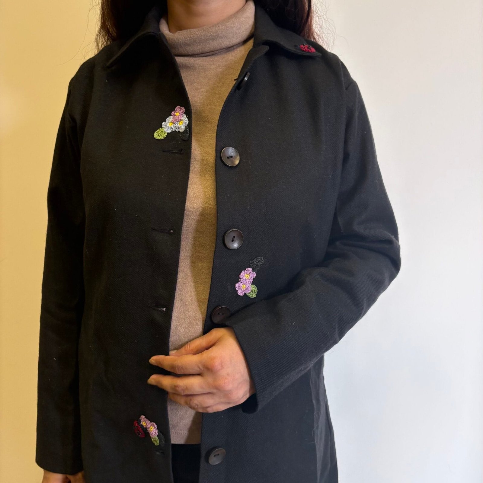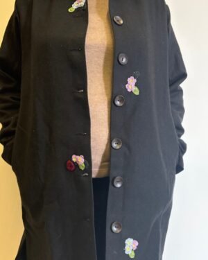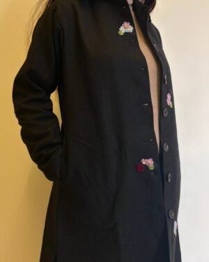 Crafted for cool days and slower moments, this black woollen jacket brings together warmth, structure, and hand-touched detail. The cotton lining keeps it soft and breathable, while delicate crochet accents add a quiet, crafted charm. Wooden buttons lend an earthy finish, and the straight fit with a 38-inch length gives it a clean, effortless fall.