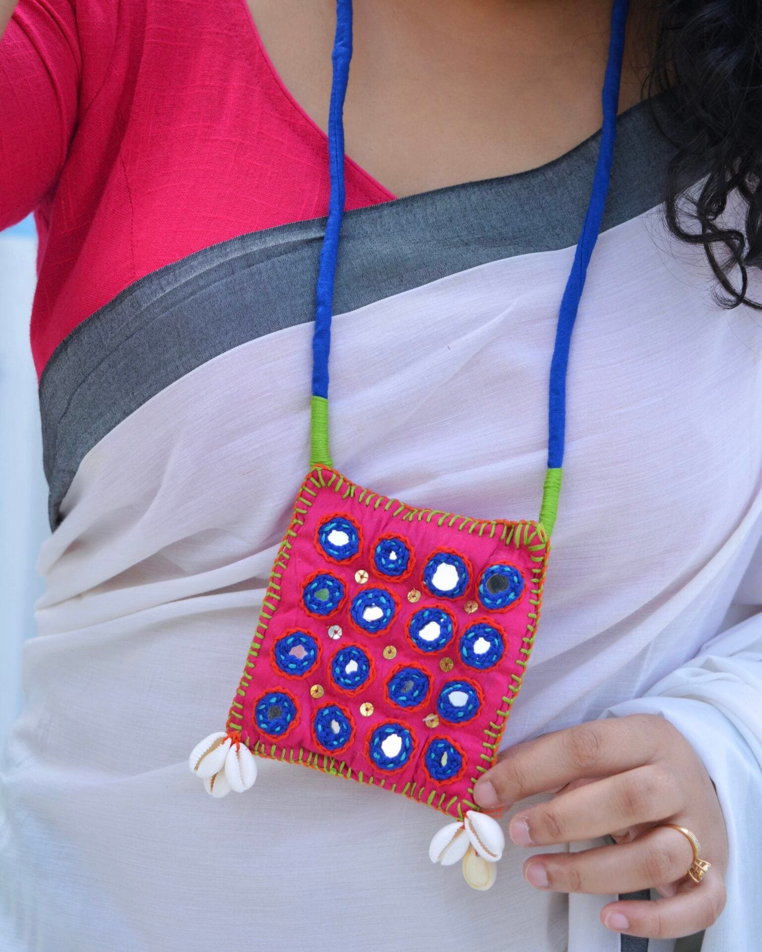Introducing the Noor Neckpiece, a stunning embodiment of artisanal craftsmanship and vibrant aesthetics. This exquisite piece is meticulously embroidered with an array of intricate stitch patterns, each element thoughtfully designed to create a harmonious blend of tradition and contemporary flair. The primary color palette of pink and blue, enhanced with subtle green accents, evokes a sense of serenity while ensuring a striking visual appeal.The Noor Neckpiece is further adorned with mirror work, adding a captivating touch of brilliance that catches the light and enhances the overall elegance of the design. This reflective detailing is complemented by exquisite cowrie work, which pays homage to cultural heritage while imbuing the piece with a unique charm.Hand-curated with precision and passion, the Noor Neckpiece is not merely an accessory; it is a statement of individuality and grace. Ideal for various occasions, it serves as a perfect complement to both traditional and modern attire, allowing