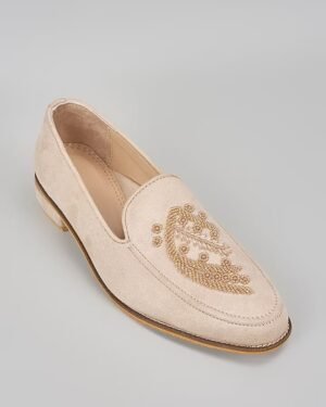 A pair of nude pink suede based loafers enhanced with hand embroidered motif. It has a padded leather lining and a hard sheeted rubber sole.