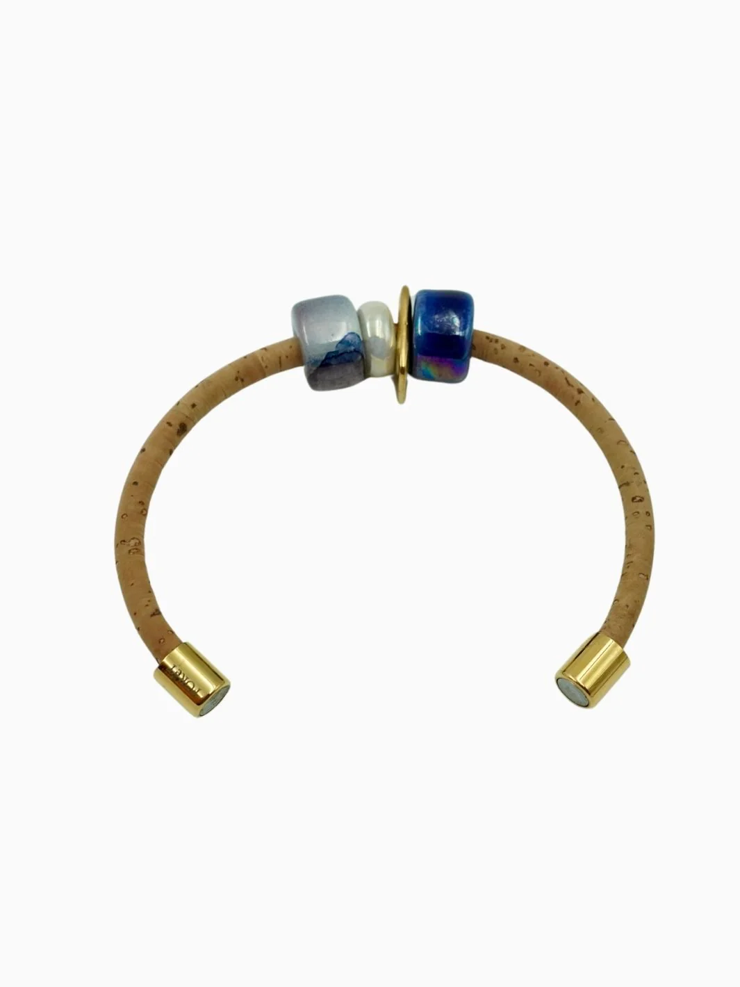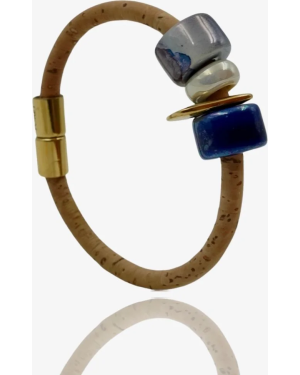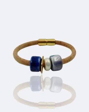 Unveil the Oceanic Splendour Bracelet, a stunning accessory for women. This bracelet features beige natural cork bark complemented by blue and white ceramic beads and a secure round gold-toned magnetic clasp. Elevate your style with this elegant and sustainable piece.