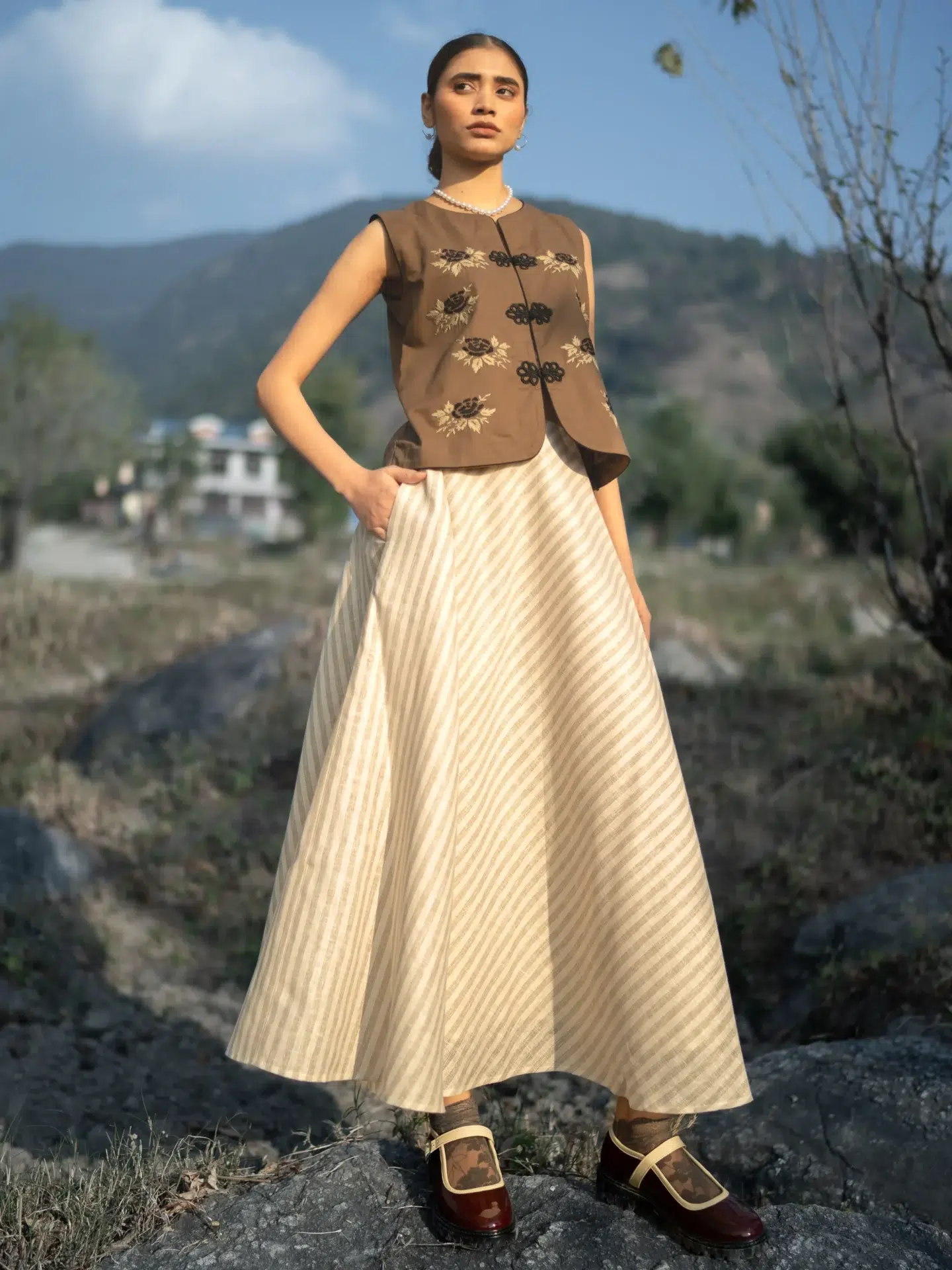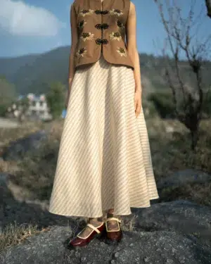 Featuring a stripes print, featuring clean waistband keeps the look sleek and structured, it has side zip opening to ensure a comfortable, flexible fit that moves effortlessly with you. It has cotton lining attached. The gentle flare adds fluidity to every step—making it a perfect choice for both casual and dressed-up edits.