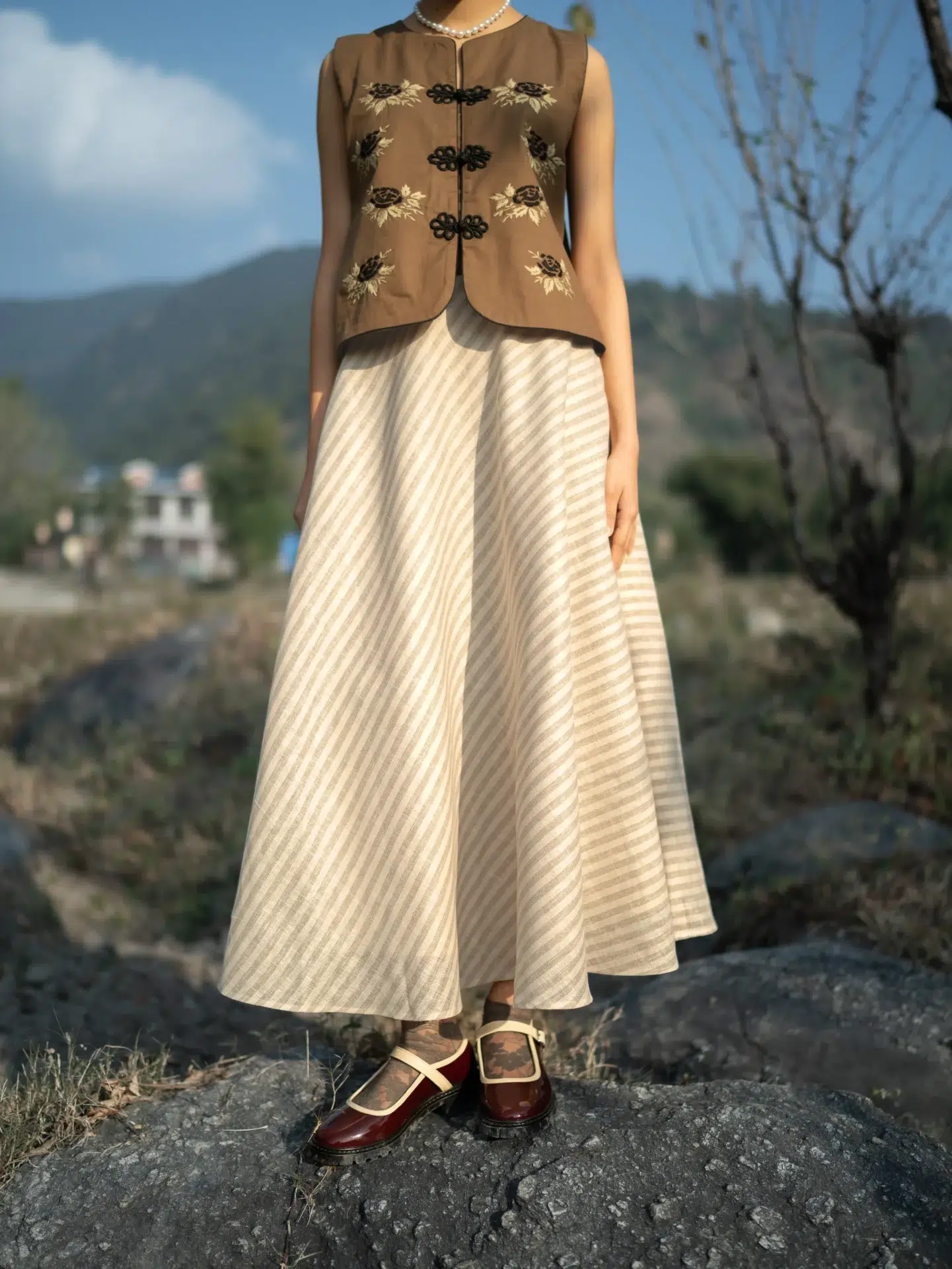 A soft cotton top featuring delicate hand-embroidered rose motifs at the front. Finished with a charming front knots closure detail, it adds a touch of uniqueness to your special days.
