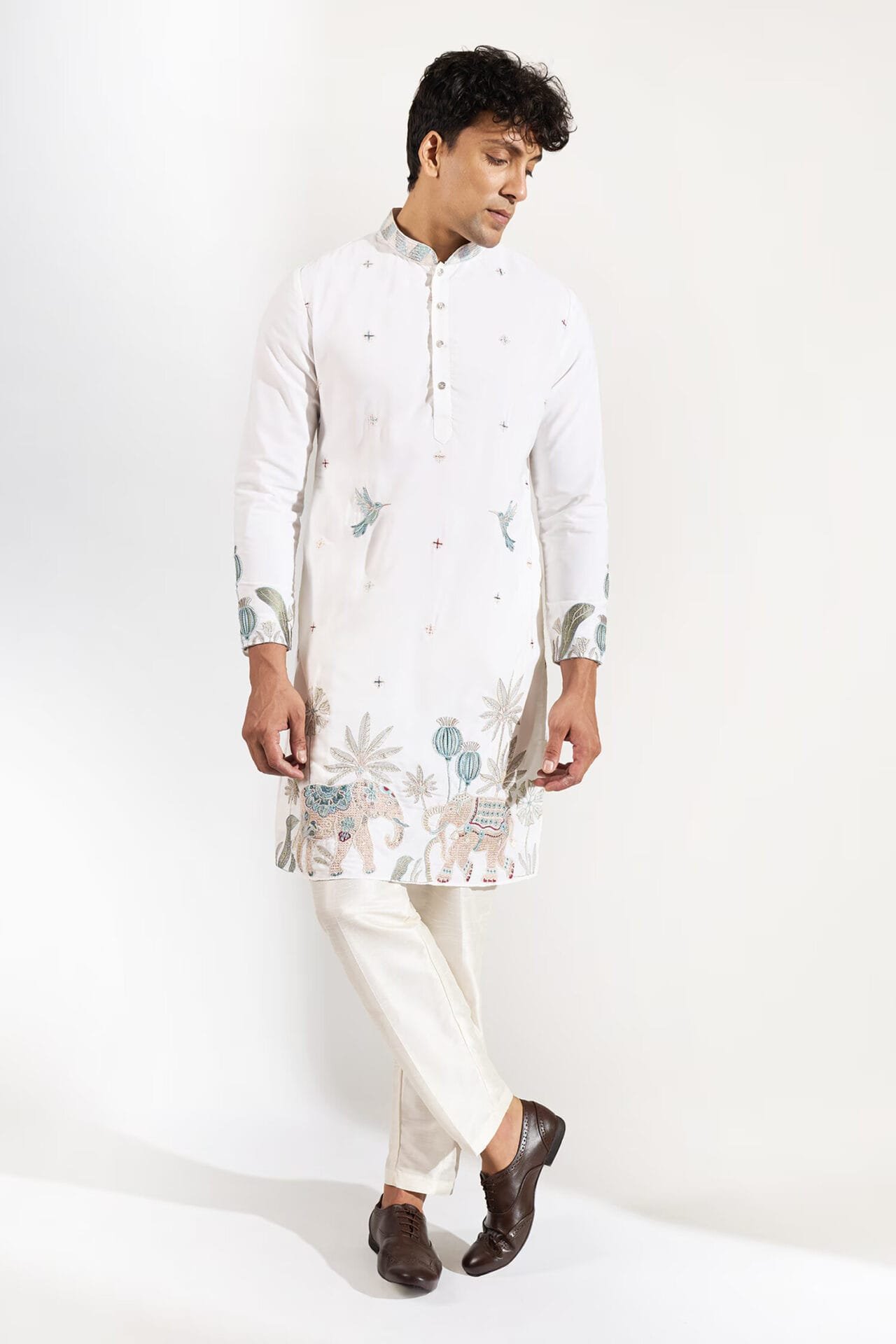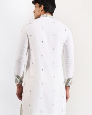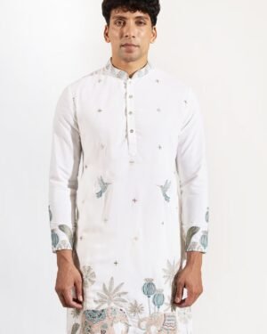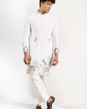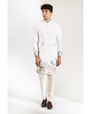 Off White crepe silk based kurta enhanced with resham, cutdana and beads embroidery and embroidered motifs paired with an off white dupion silk based pants.