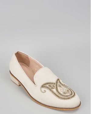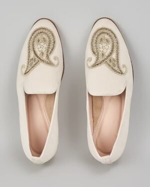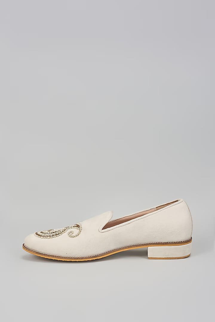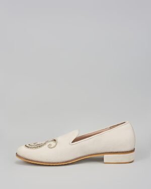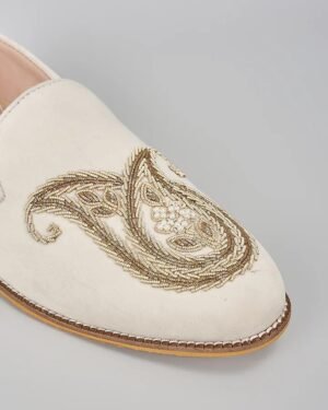 A pair of off white suede based slip on peshawaris enhanced with hand embroidered paisley motif. It has a padded leather lining and a hard sheeted rubber sole.