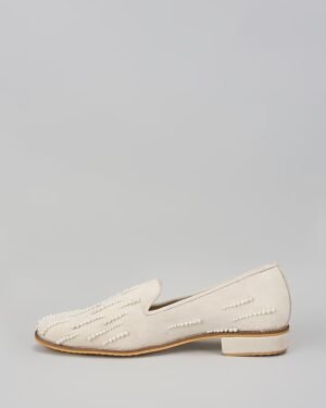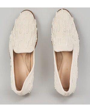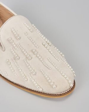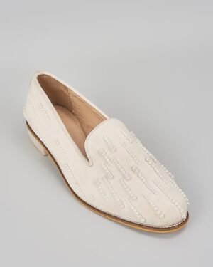 A pair of off white suede based loafers enhanced with hand embroidered pearls. It has a padded leather lining and a hard sheeted rubber sole.