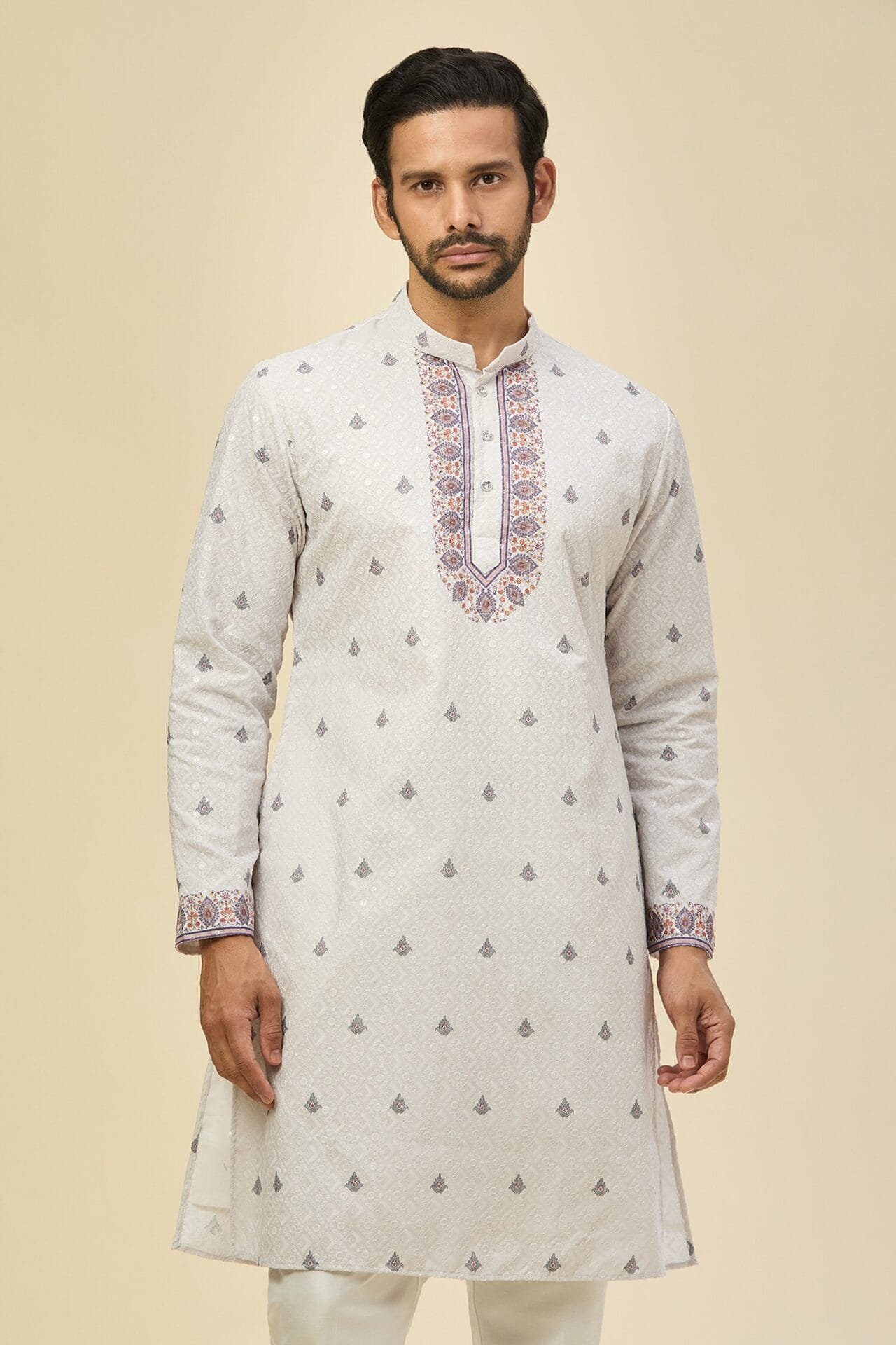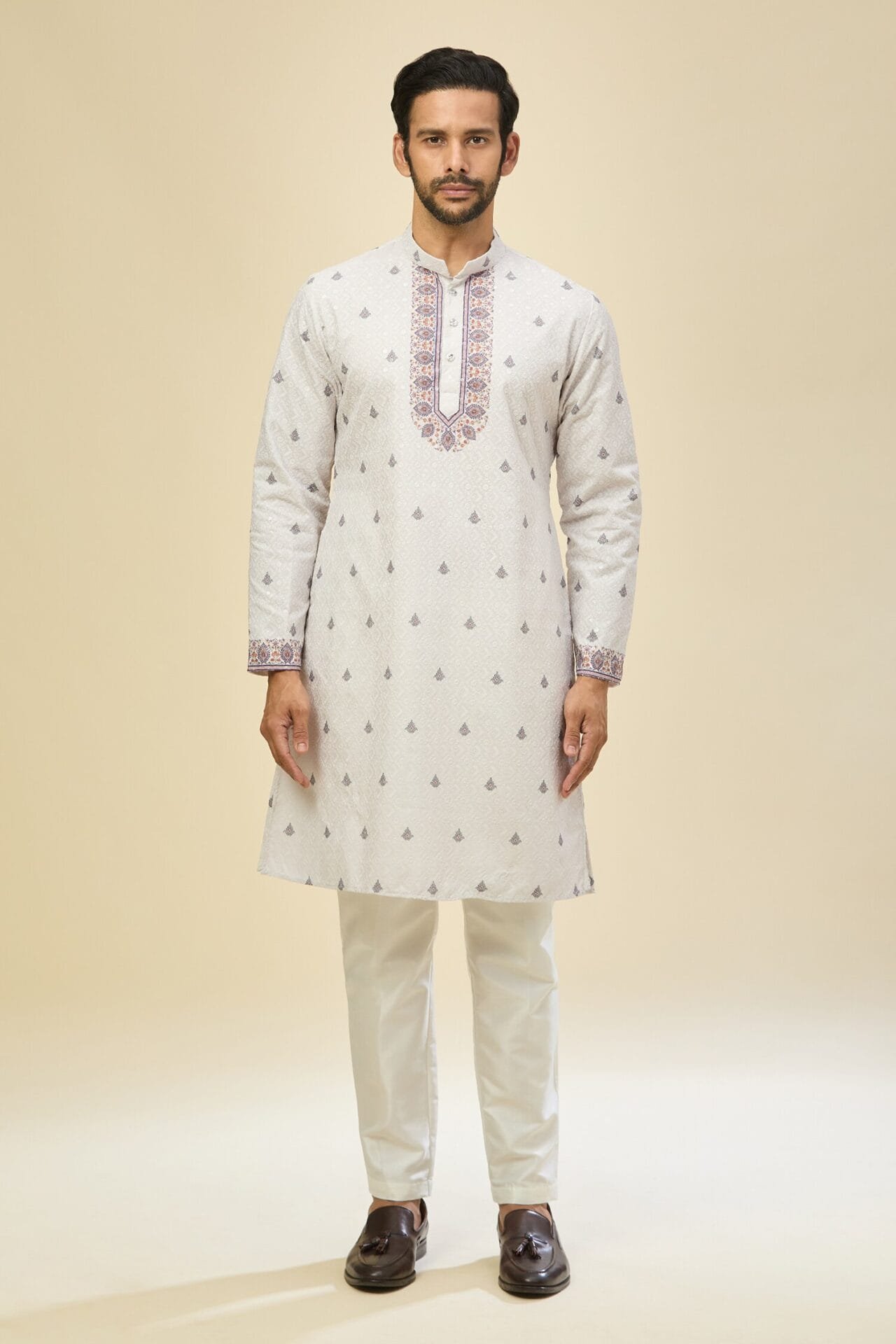 Off white crepe silk based kurta enhanced with all over self chikankari embroideru and paisley print, paired with an off white dupion silk mexican pants.