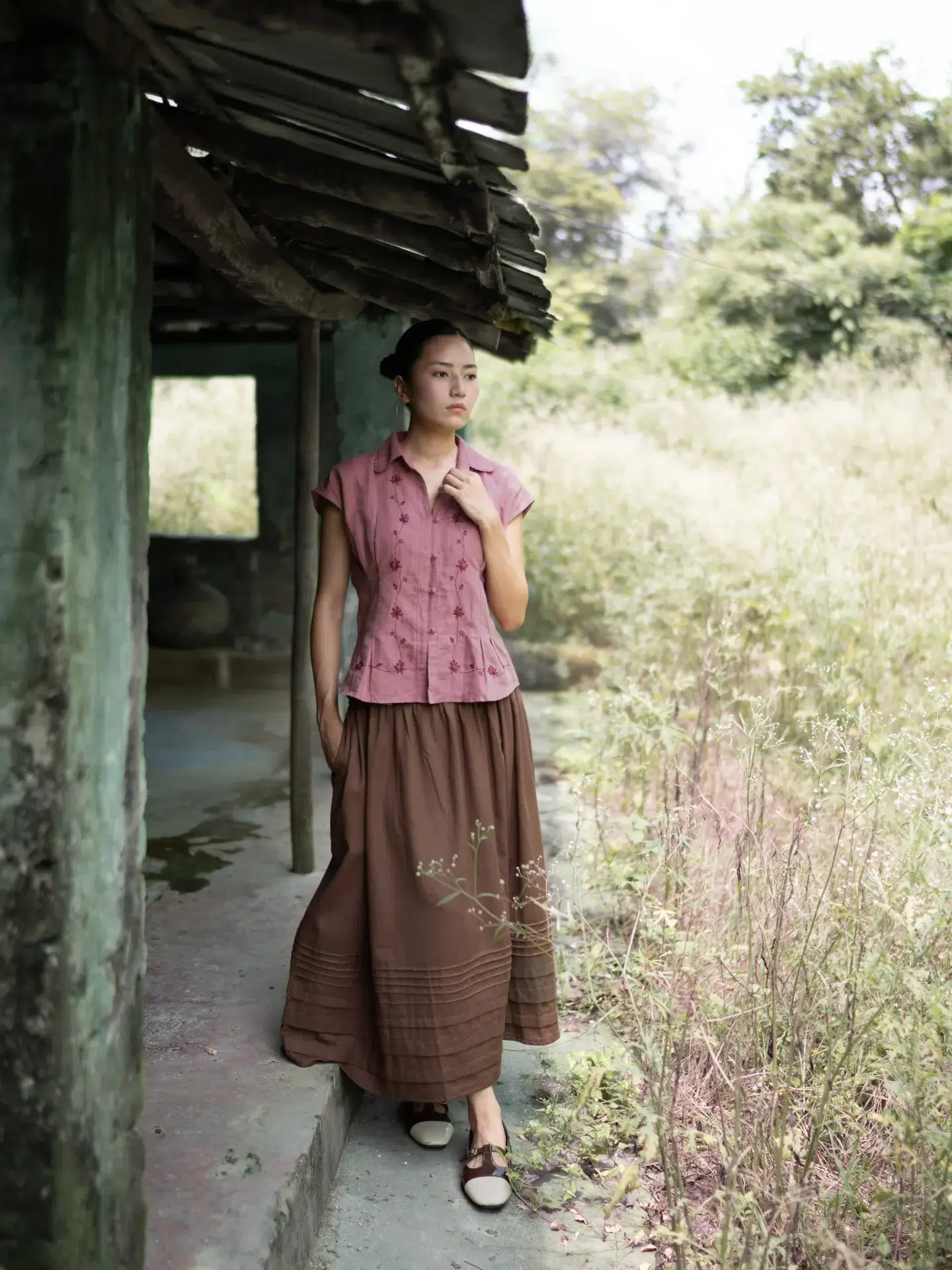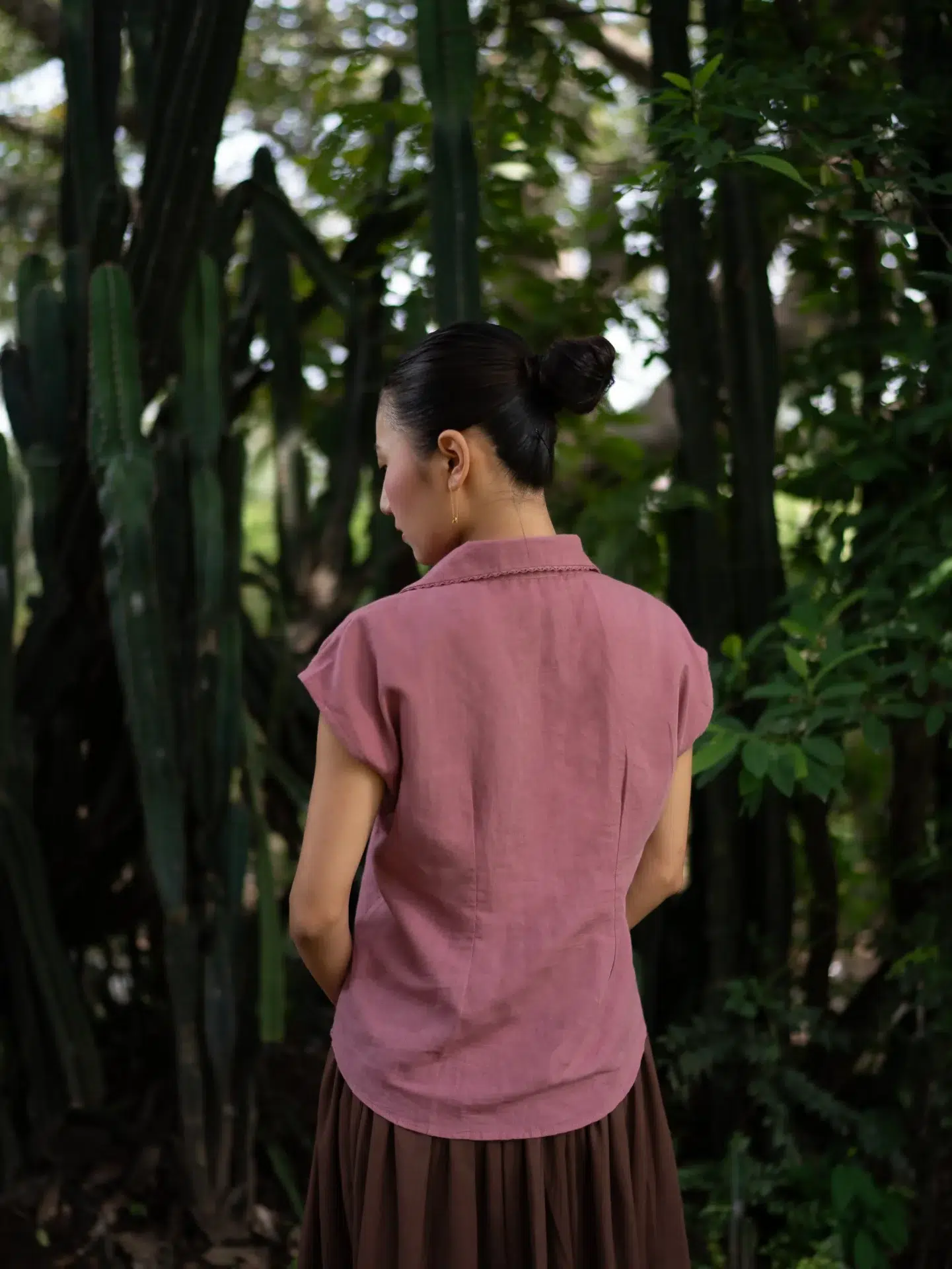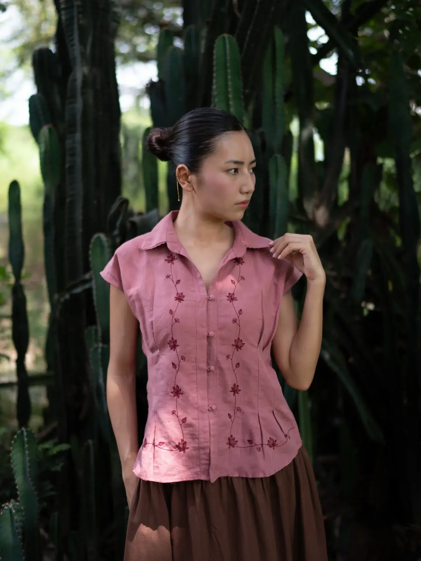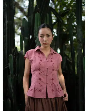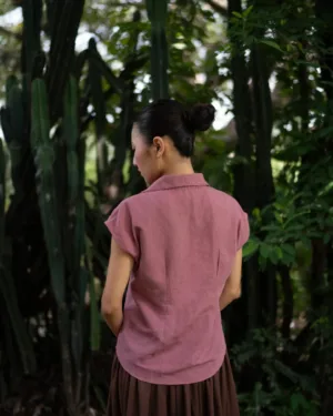 This soft pink linen top features a collared neckline with delicate hand-embroidered detailing and front pleats at the waist for a subtly tailored fit. Paired with a rich mocha brown skirt, it offers an elegant balance of structure and ease. Style with nude heels for a polished brunch look or woven flats for a relaxed day out — a versatile piece that moves effortlessly from casual to refined occasions.