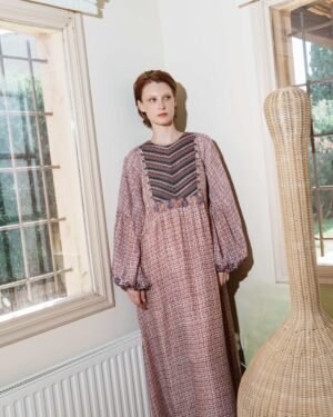 A beautifully detailed Onion pink printed maxi with embroidered yoke and schfflie hemline that reflects Pinnacle by Shruti Sancheti?s artisanal precision and timeless design language.