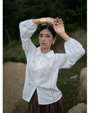 In crisp white cotton-linen, this top features a charming Peter Pan collar trimmed with lace and delicate hand embroidery at the front. Pleated lace detailing on the sleeves adds a vintage touch. Pair it effortlessly with a neutral or striking skirt for a timeless look.