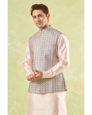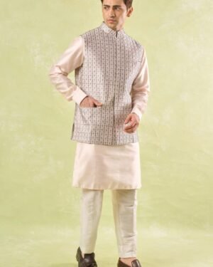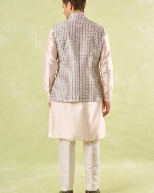 Peach raw silk based jacket enhanced with thread embroidery paired with an off white dupion silk based kurta and an off white dupion silk based mexican pants.