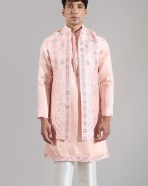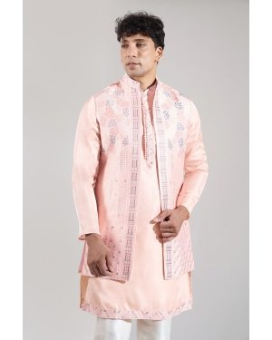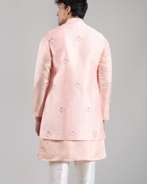 Peach crepe silk based long open jacket enhanced with resham embroidery, paired with a matching kurta and an off white dupion silk based pants.