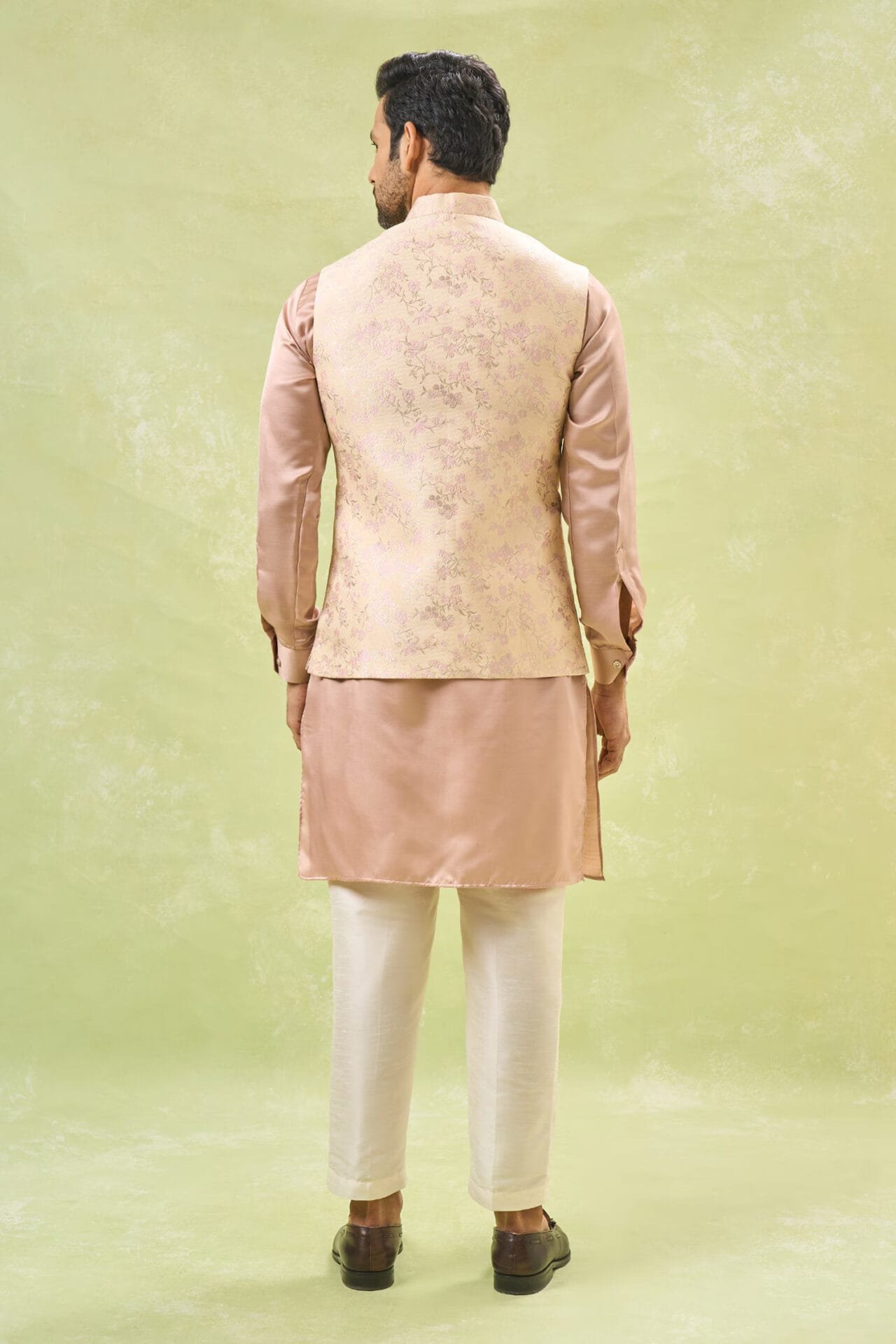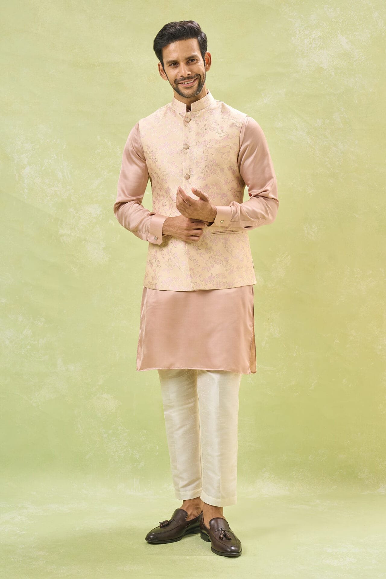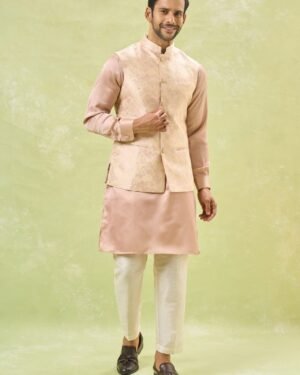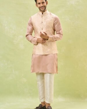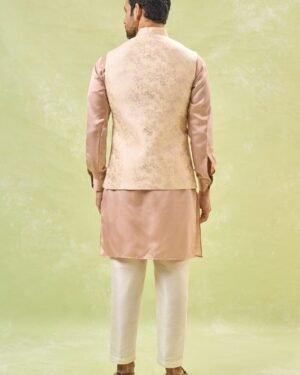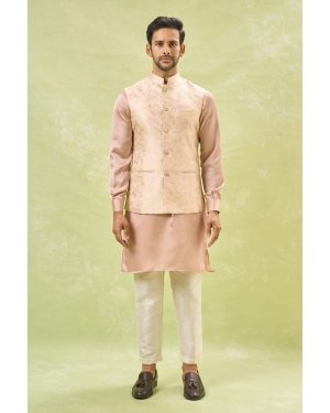 Cream brocade silk based jacket with floral zari print, paired with a blush pink cotton silk based kurta and an off white dupion silk based pants.
