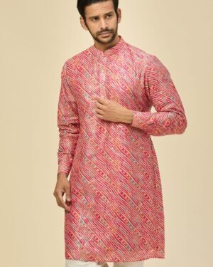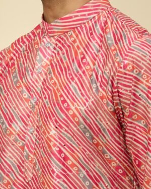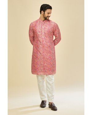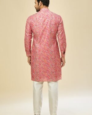 Pink cotton silk based leheriya print kurta enhanced with sequins, paired with an off white dupion silk based mexican pants.