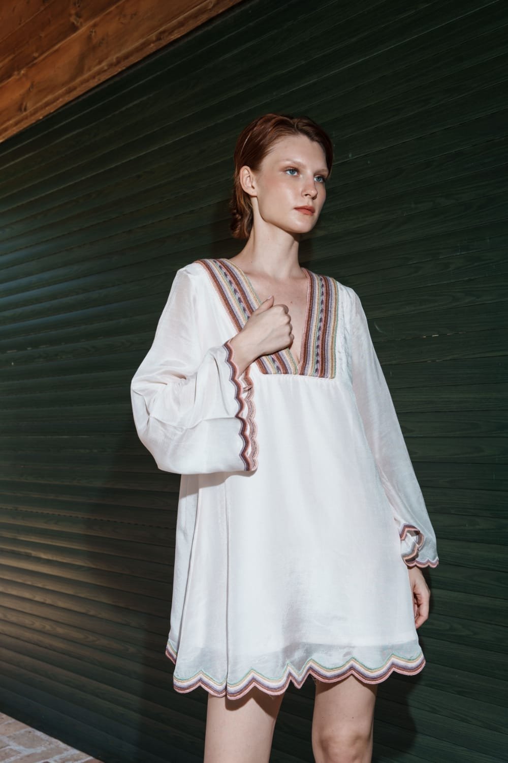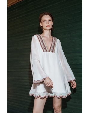 Crafted in fine fabric, this Pink mul embroidered scallop mini dress showcases Pinnacle by Shruti Sancheti?s timeless craftsmanship and feminine grace. A perfect piece for effortless day-to-evening elegance.