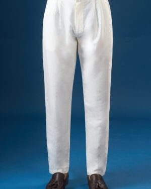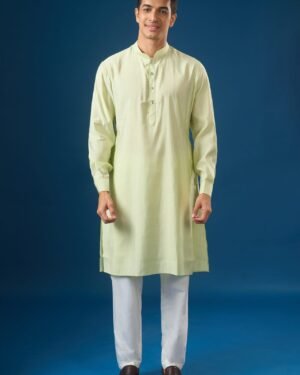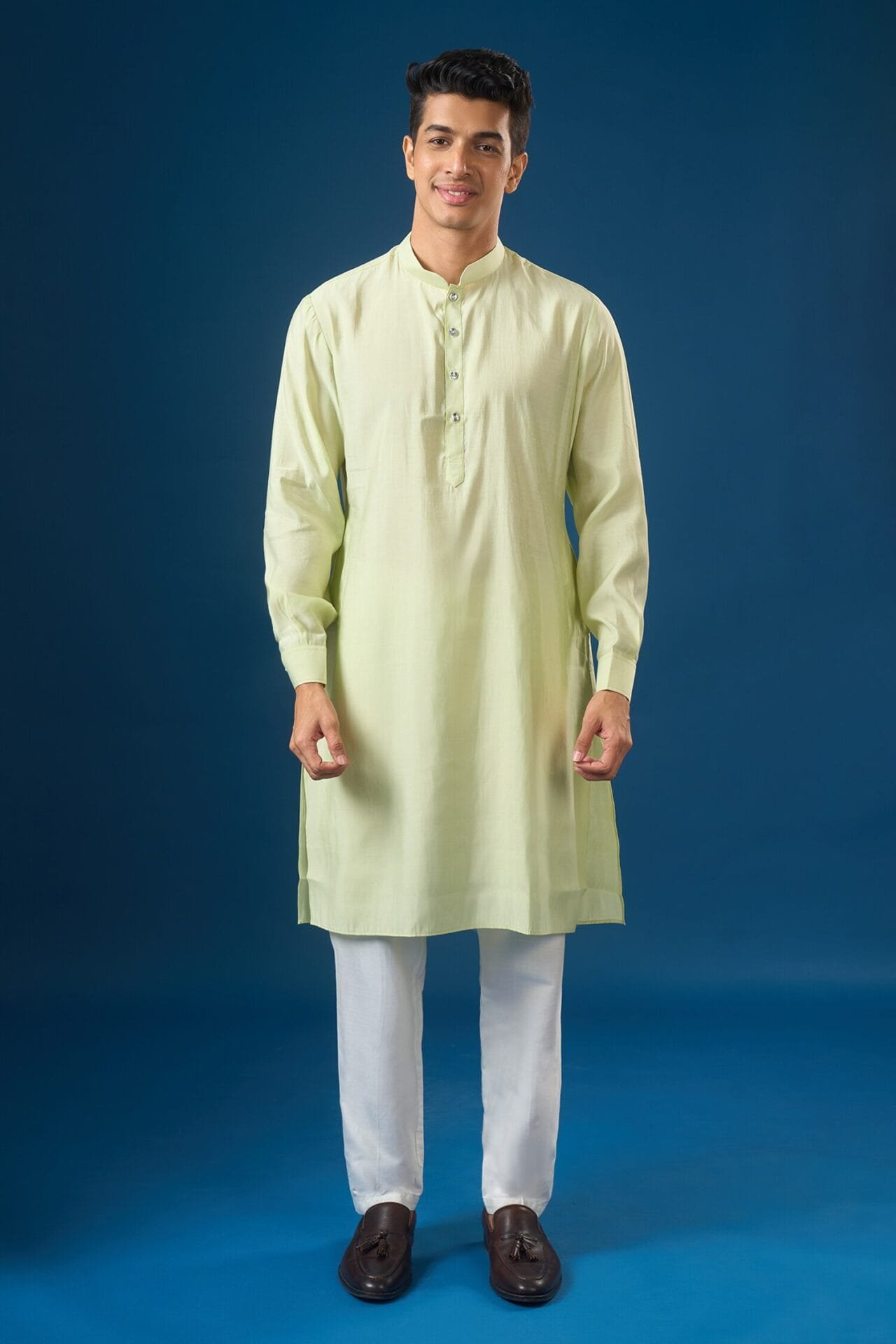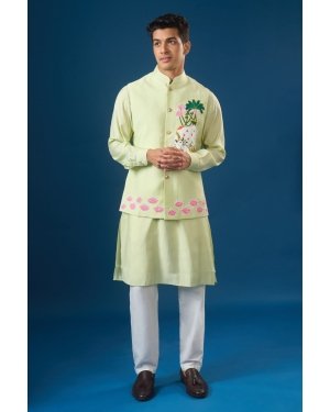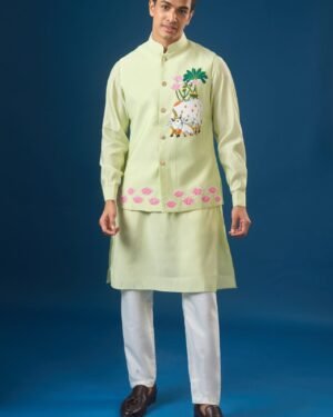 Pista Green cotton silk based jacket enahnced with god idol resham and cut dana embroidery, paired with a matching cotton silk kurta and off white dupion silk based pants.