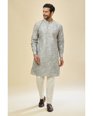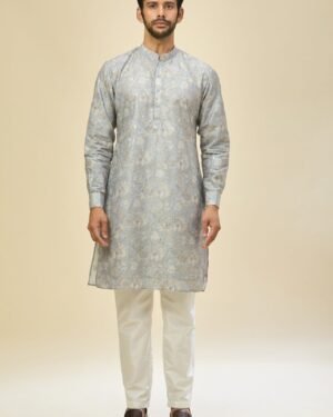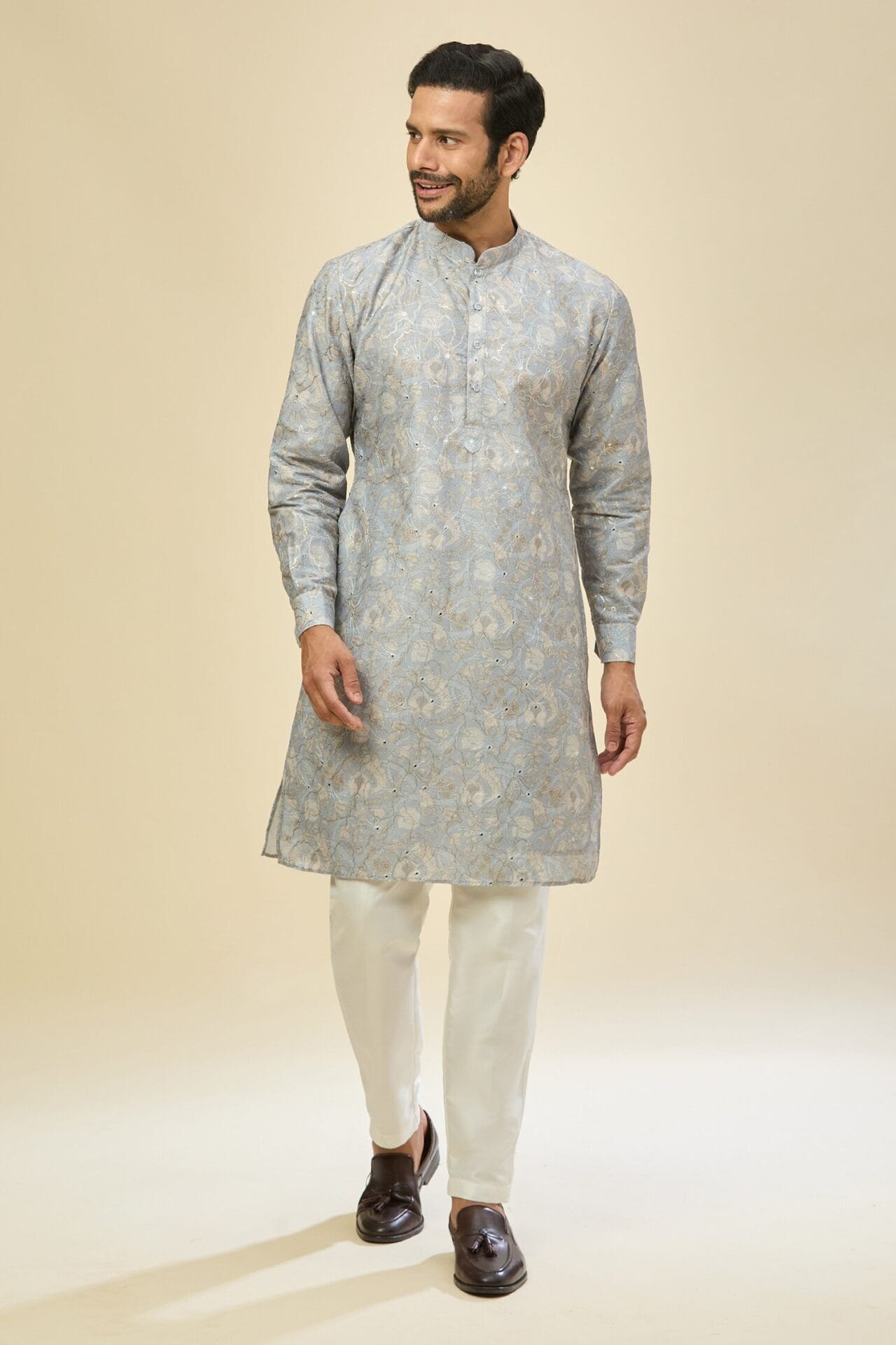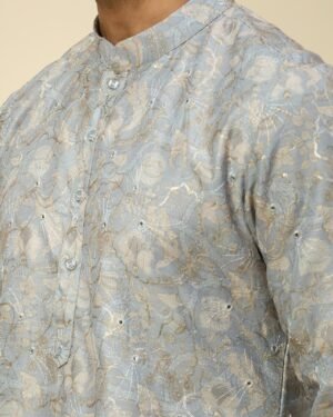 Powder Blue cotton silk based paisley print kurta enhanced with sequins, paired with an off white dupion silk based mexican pants.