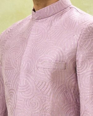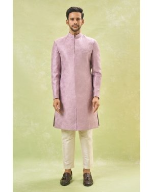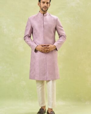 Purple raw silk based achkan enhanced with thread and sequin embroidery, paired with an off white dupion silk based pants.