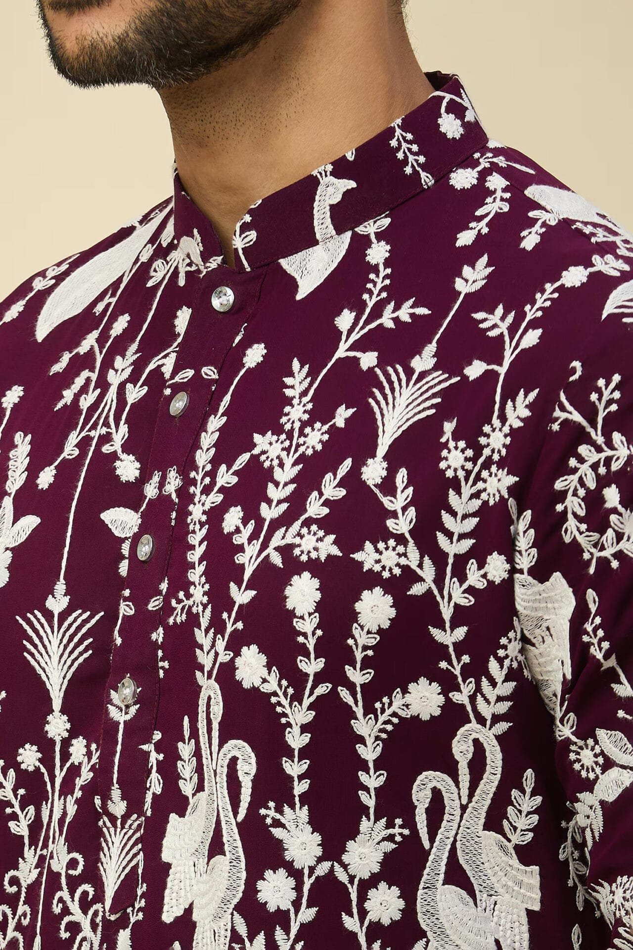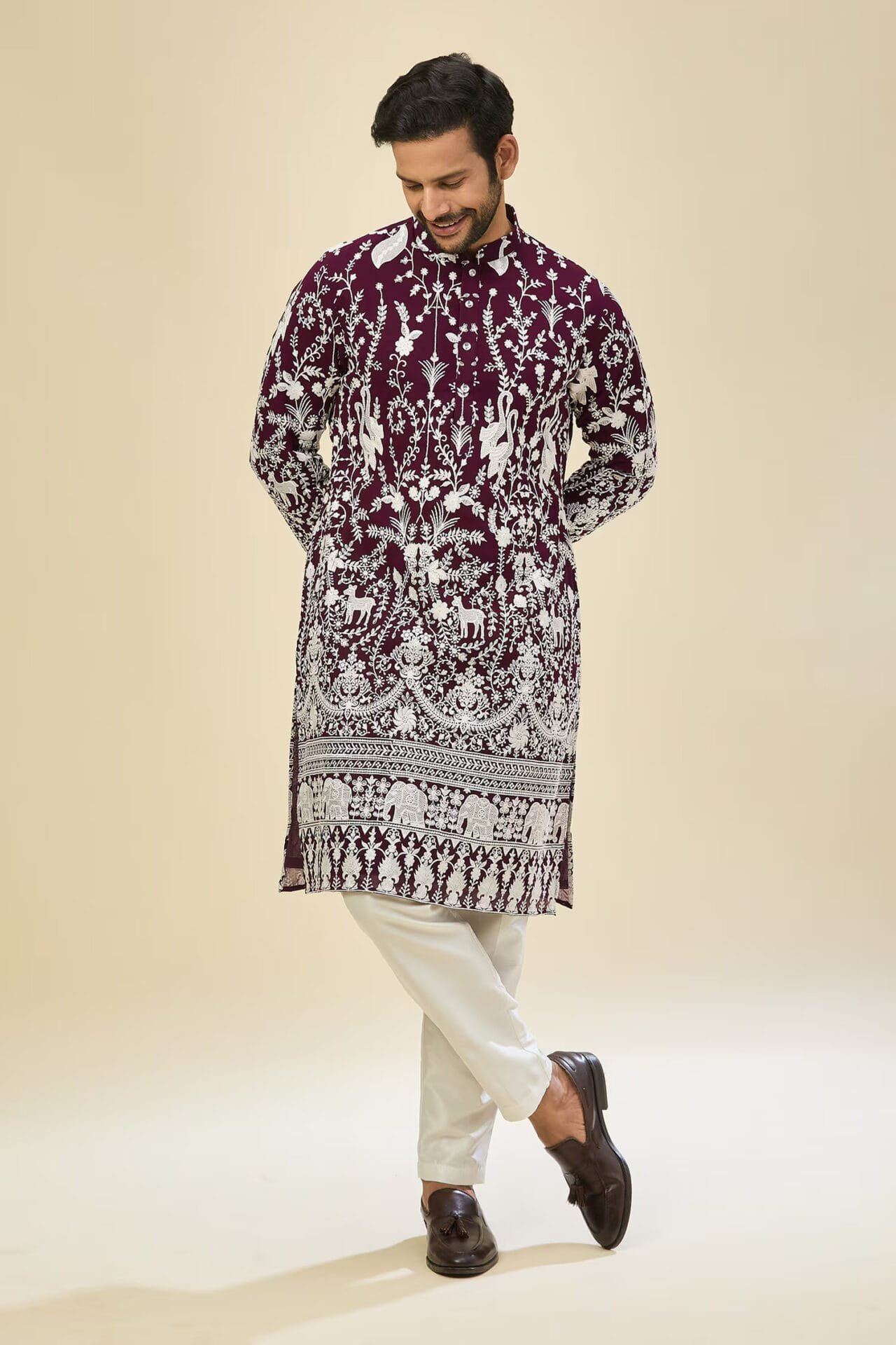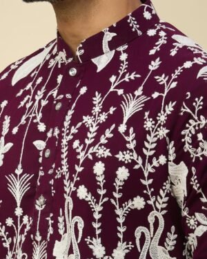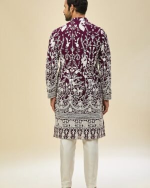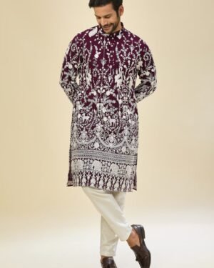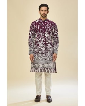 Purple georgette based kurta enhanced with thread embroidery, paired with an off white dupion silk based mexican pants.