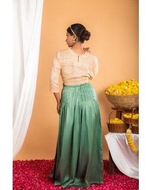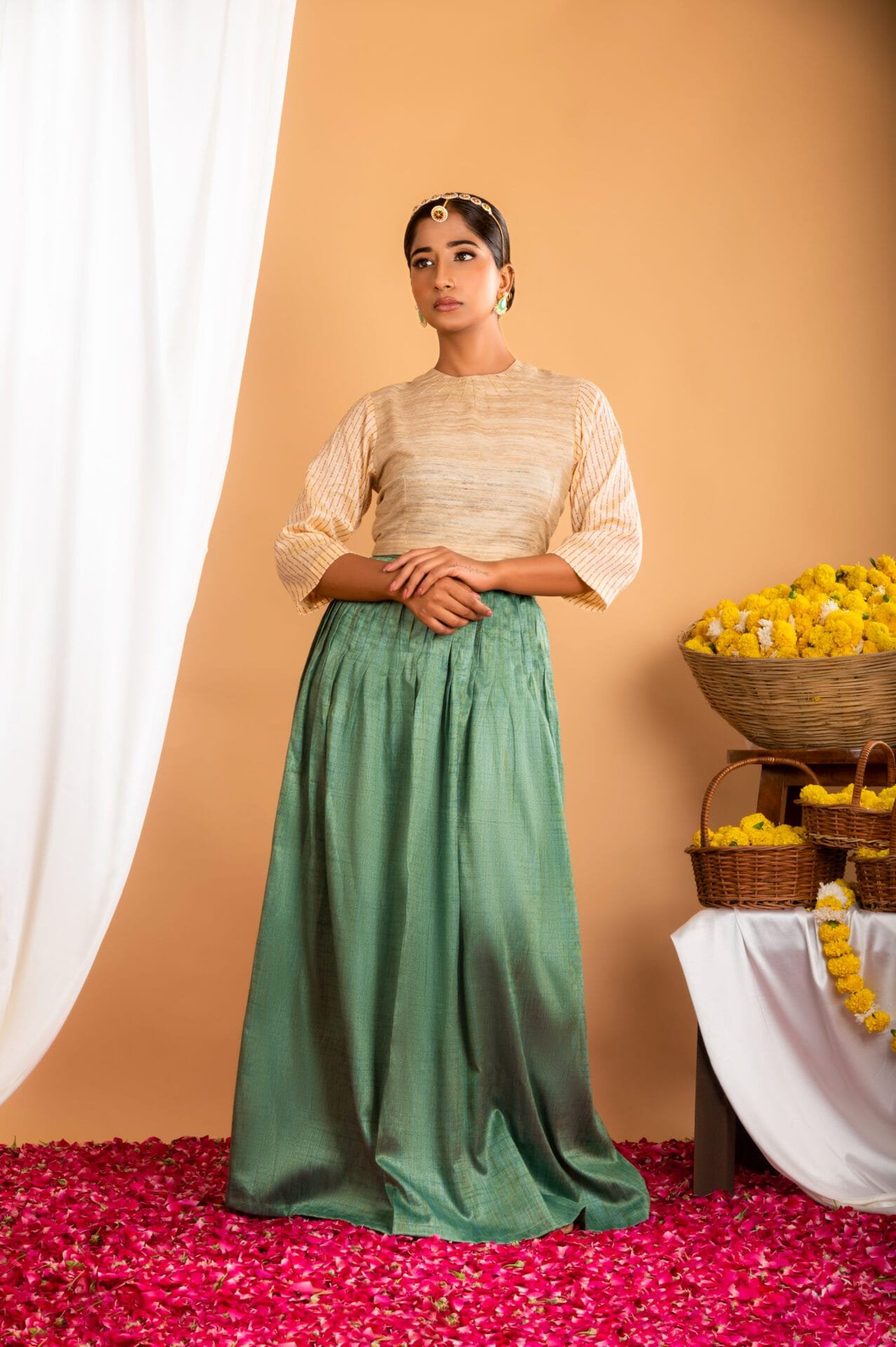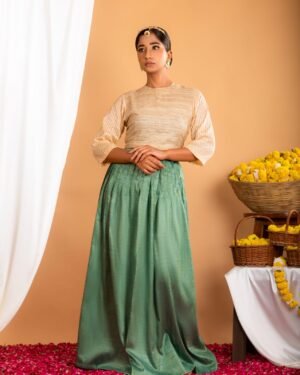 Celebrate in style with this high waisted skirt featuring elegant pleats at the upper waist cascading halfway crafted from pure silk in a shimmering blue green hue. WASH INSTRUCTIONS - ONLY DRYCLEAN. Transparency & Certificate: Made in India with care, using natural dyes and produced in small batches with ISO certification. Shipping Courier charges DOMESTIC(IN INDIA) : ?500/KG, INTERNATIONAL : ?3000/KG