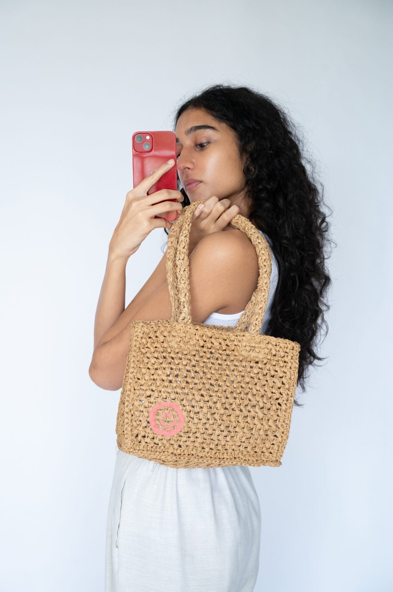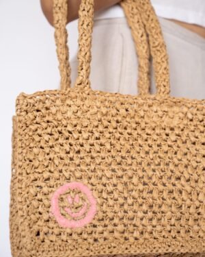 This raffia straw bag brings summer vibes wherever you go. Hand-woven with care, it?s a stylish accessory that adds charm to any outfit. The mini tote features a main compartment and two handles, allowing you to carry it as a handbag or wear it over your shoulder for comfort. Finished with the signature OL smiley, it is locally sourced and handmade.