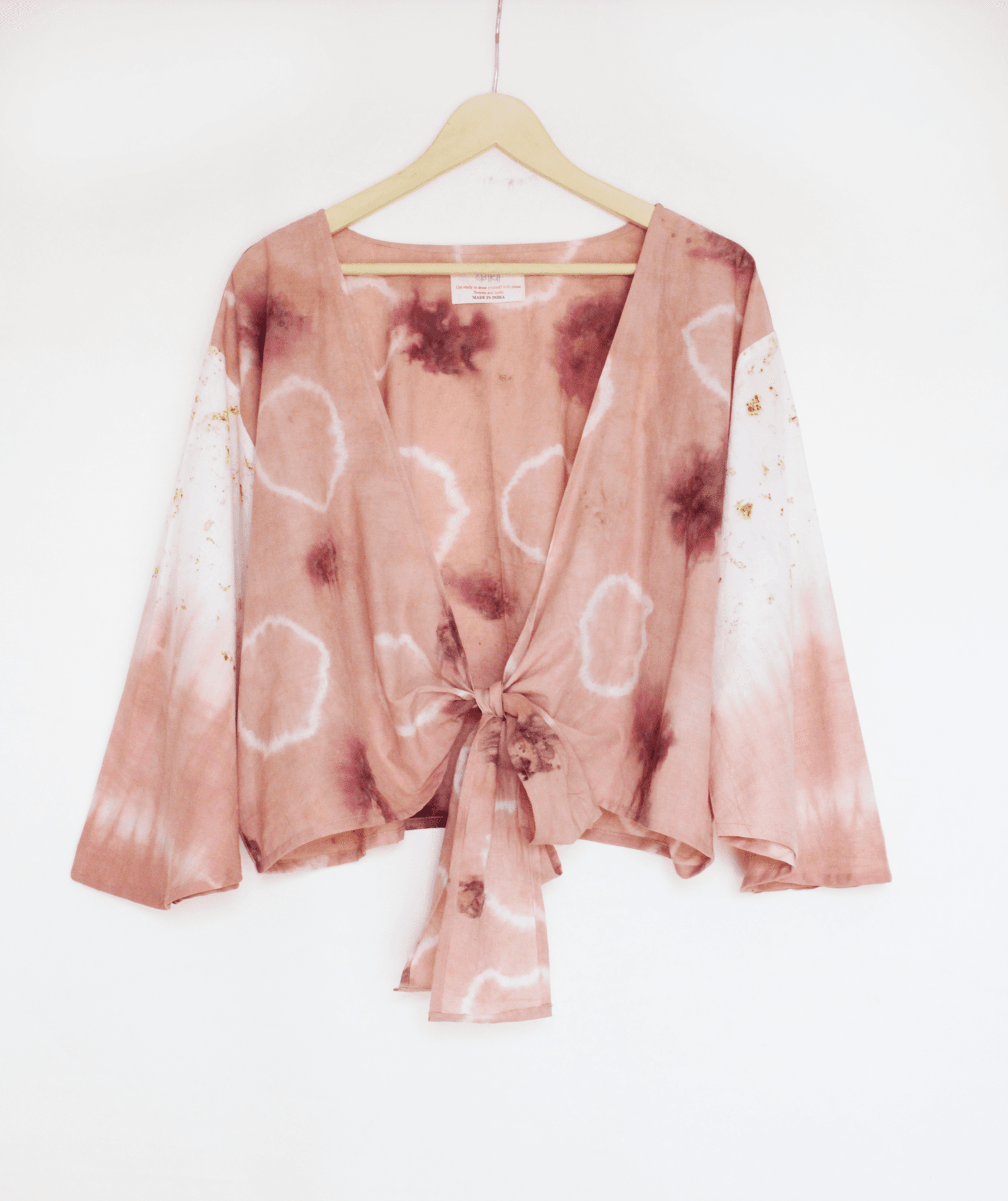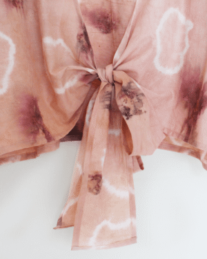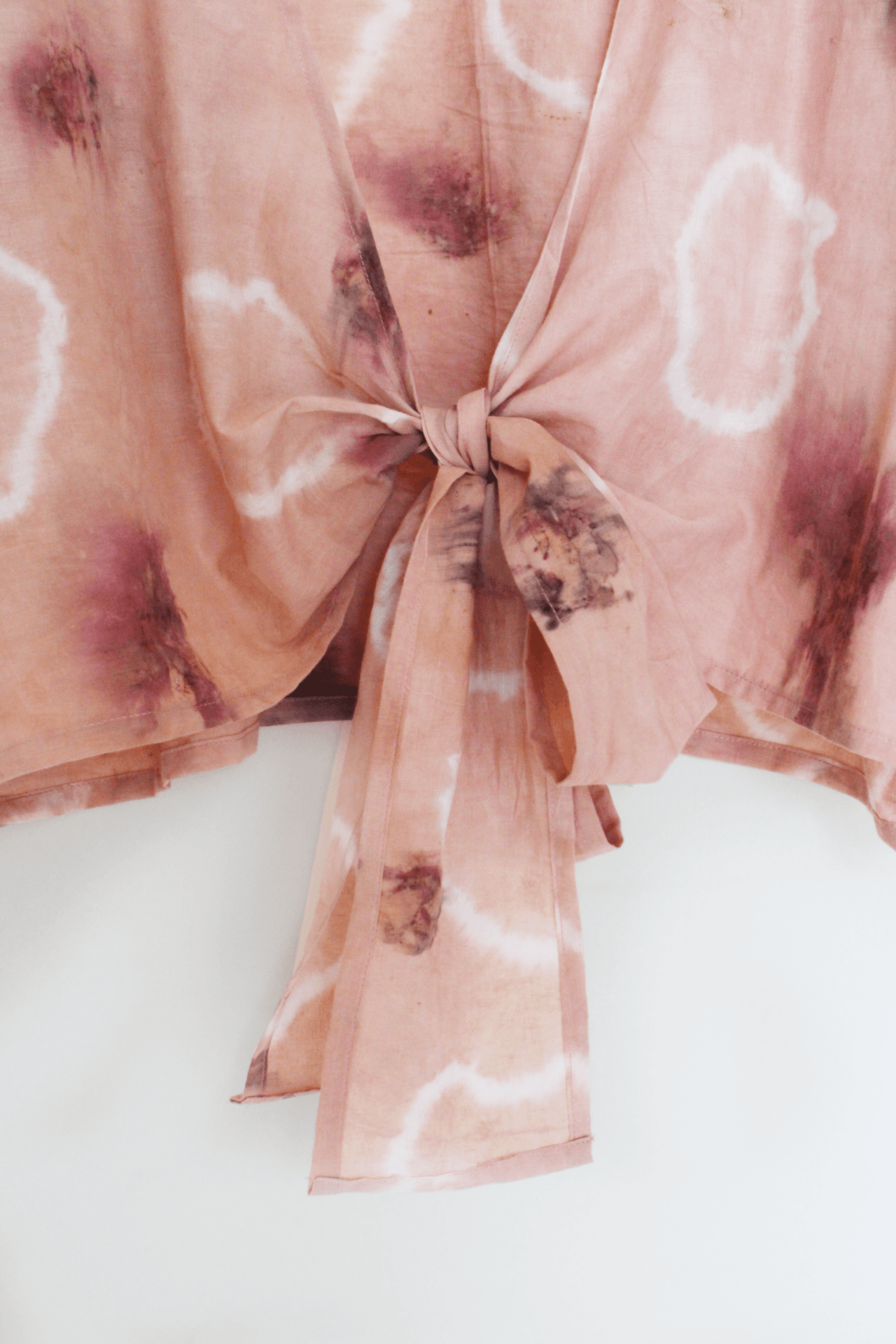 Bageeya's "Ratanjot" Breezy tie-up indulges in effortless style featuring romantic bell sleeves. Made from breathable Organic Cambric cotton, this top is perfect for warm days. Look closer and discover the unique charm - the fabric is dyed using a time-honored technique with sacred temple Rose, Marigold and Manjishta, all-natural and kind to the environment. Crafted from pure Cambric cotton, our Breezy tie-up tops offer unparalleled comfort and breathability. The fabric is luxuriously soft against the skin, making it ideal for warmer weather. But what truly sets this top apart is its remarkable dye story. We use a traditional tie-and-dye technique to infuse the fabric with vibrant colors derived from natural sources - sacred temple flowers like rose and marigold, along with Manjishta. This eco-conscious approach not only creates stunning visual effects but also helps reduce marine pollution caused by synthetic dyes. The Ratanjot Breezy tie-up is a beautiful fusion of