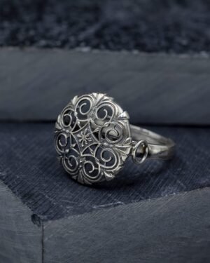 Raitt binti is a statement ring, its top measures 2.2 cm and is adjustable ring size. The ring is handcrafted in 92.5% silver,with anti tarnish coating & has delicate lattice details with a silver oxidized finish., Plating: Silver Ani-tarnish with oxide finish, Metal Type: 92.5% Sterling Silver, Enamel / plating / gemstone: Silver oxidised, Lock Mechanism: Adjustable Ring, Measurement cm : Top diameter - 1.77cm, Measurement inches: Top diameter - 0.69 inch, Care Instruction: Keep away from water, perfume and other liquids. Do not use any cleaning agents. Clean when storing in the provided pouches. Store them in moisture free areas and keep them away from water and liquid fragrances.