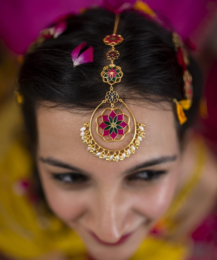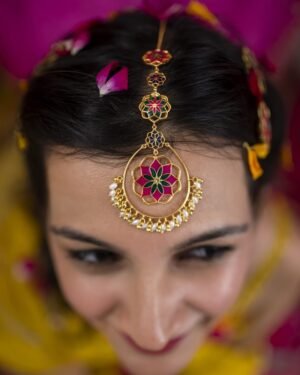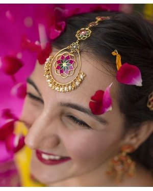 This Gul Roja Tika with flower motif and hanging ghungroos & pearls is handcrafted in 92.5% sterling silver, with thick gold plating. It has enamel details in vibrant colors, with flower motif design and has a hook at the end of the chain for easy adjustments., Plating: Gold Plated, Metal Type: 92.5% Sterling Silver, Enamel / plating / gemstone: Transparent Enamel, Lock Mechanism: Hook mechanism , Measurement cm : 9 cm ?, Measurement inches: 3.54 inch, Care Instruction: Keep away from water, perfume and other liquids. Do not use any cleaning agents. Clean when storing in the provided pouches. Store them in moisture free areas and keep them away from water and liquid fragrances.