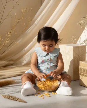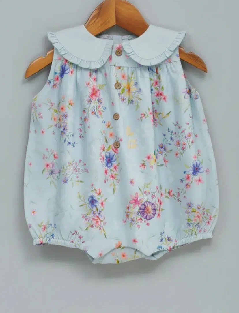 A sweet, classic romper with pretty, wild florals digitally printed with AZO free pigments. Delicate frills on the contrast collar add to its elegance