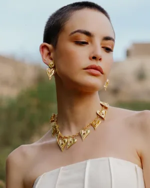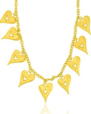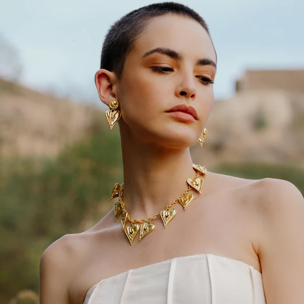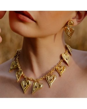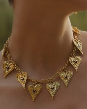 The Romantic Rhapsody Heart Pendant Necklace is a timeless expression of love, elegance, and femininity. Designed with a classic heart motif, this necklace beautifully captures emotions of romance, affection, and connection, making it a meaningful addition to any jewelry collection.Each piece is handmade using premium brass alloy and finished with 22KT real gold plating, offering lasting shine, durability, and a luxurious gold finish. Its refined design makes it versatile enough for daily wear, romantic occasions, festive celebrations, or evening styling.Lightweight and comfortable, the necklace sits gracefully on the neckline, adding a soft yet elegant glow to any outfit. Whether worn solo for a minimalist look or layered with other necklaces for a modern style, it enhances both casual and formal ensembles.This heart pendant necklace makes a thoughtful gift for women—perfect for birthdays, anniversaries, Valentine’s Day, weddings, or self-gifting. The Romantic Rhapsody Necklace blends handcrafted artistry with emotional symbolism, making it