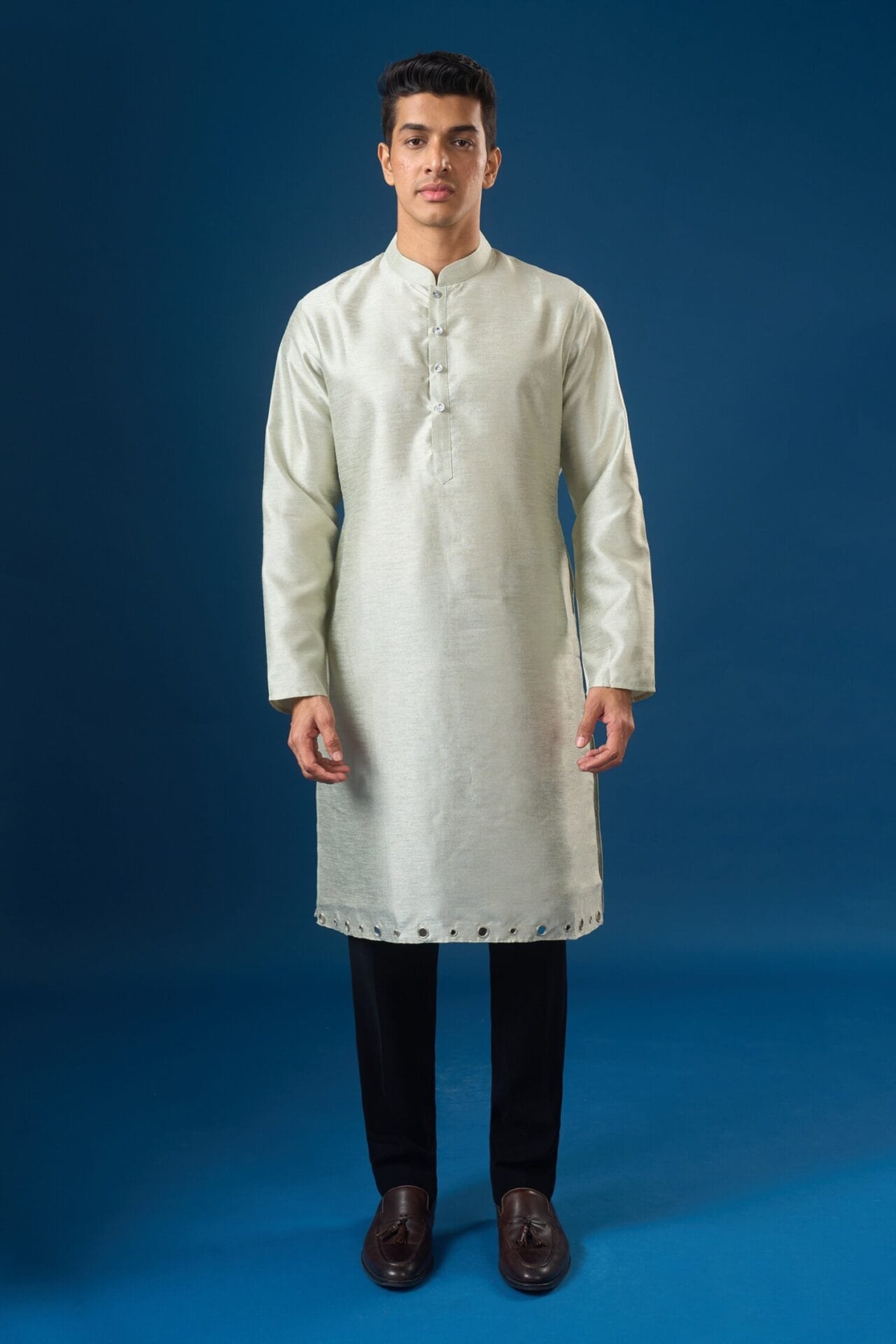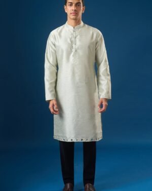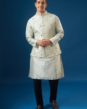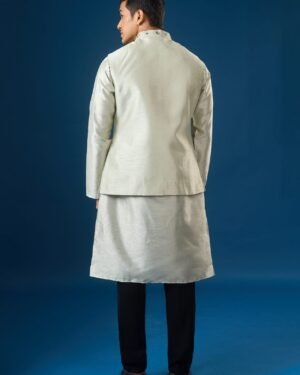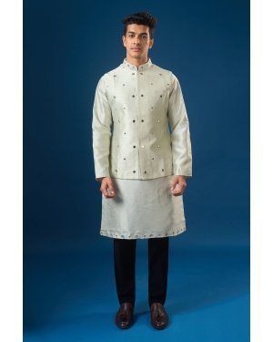 Sage Green raw silk based jacket enhanced with mirror and thread embroidery, paired with a matching dupion silk based kurta enhanced with matching embroidered hem, and off white dupion silk based pants.