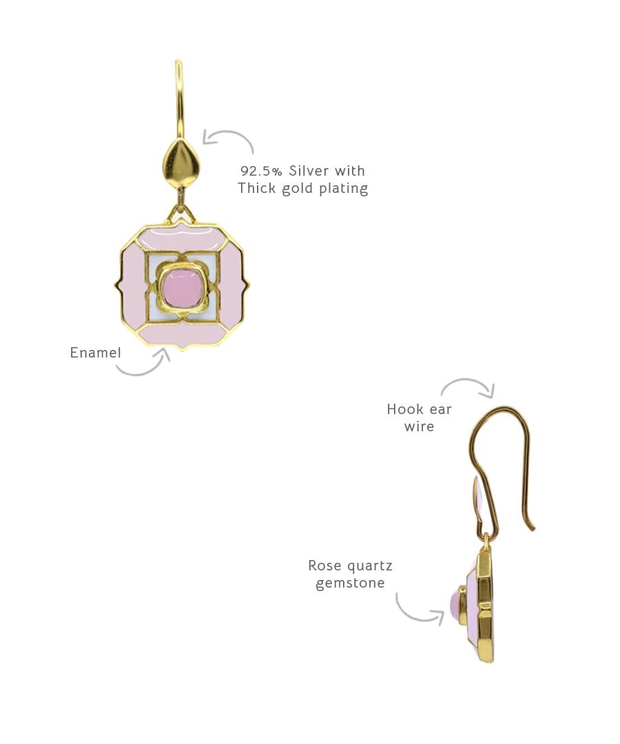 These easy to wear?Sea Breeze Earrings?brings a fresh pop of color to your style. These earrings are handcrafted in 92.5% silver, with thick gold plating & with enamel details, super easy to wear with ear wire mechanism., Plating: Gold Plated, Metal Type: 92.5% Sterling Silver, Enamel / plating / gemstone: Natural gemstone Rose Quartz, Lock Mechanism: Ear wire hook, Measurement cm : 3.2cm , Measurement inches: 1.25 inch, Care Instruction: Keep away from water, perfume and other liquids. Do not use any cleaning agents. Clean when storing in the provided pouches. Store them in moisture free areas and keep them away from water and liquid fragrances.