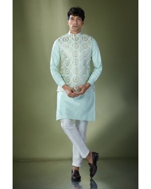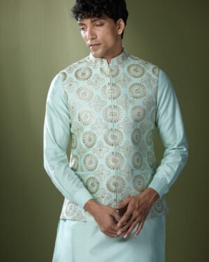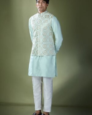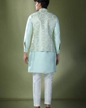 Sea Green raw silk based jacket enhanced with embroidered gota motifs paired with a matching cotton silk based kurta and an off white dupion silk based pants.