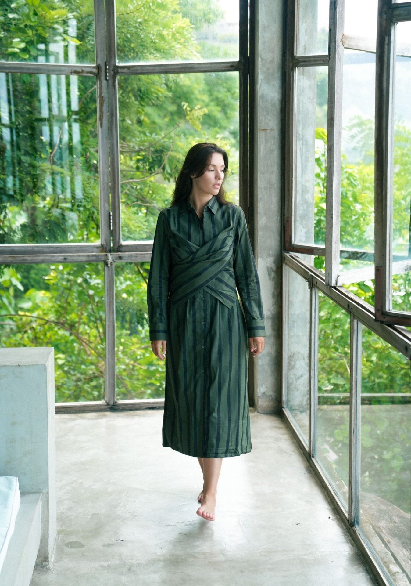 A flowy wrap dress with elegant stripes for effortless comfort.