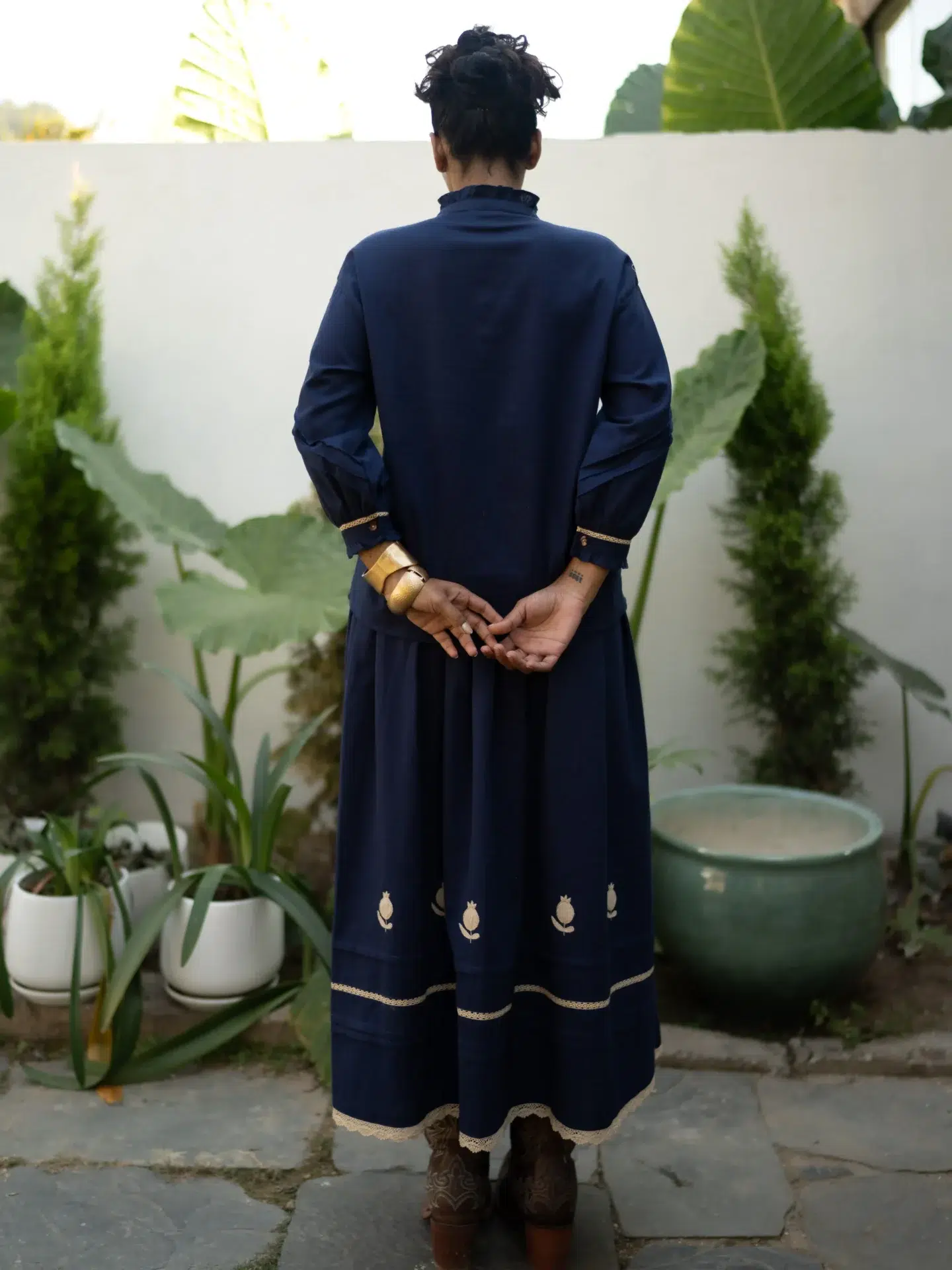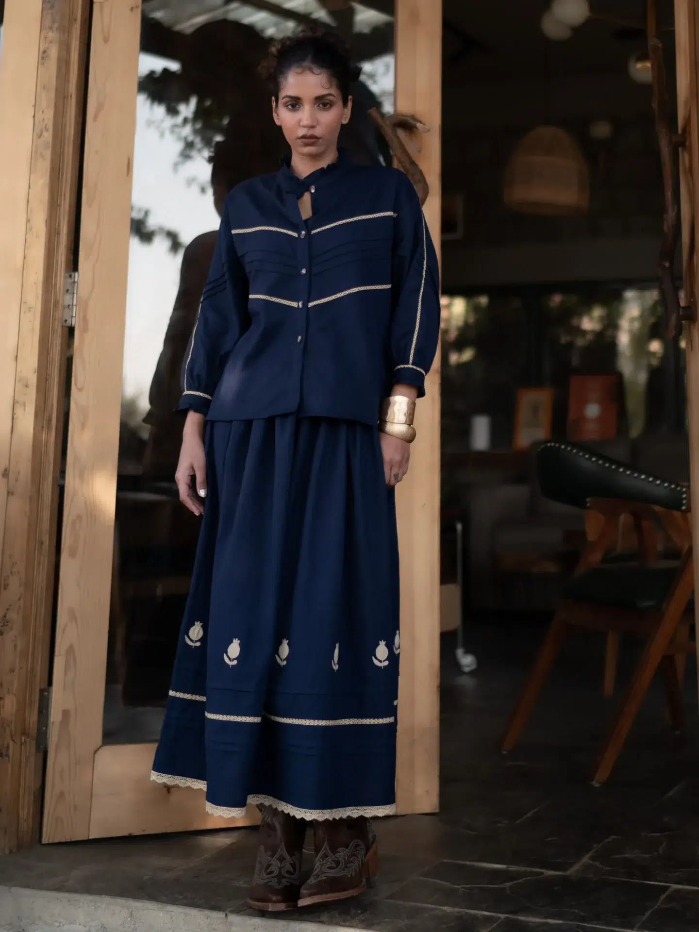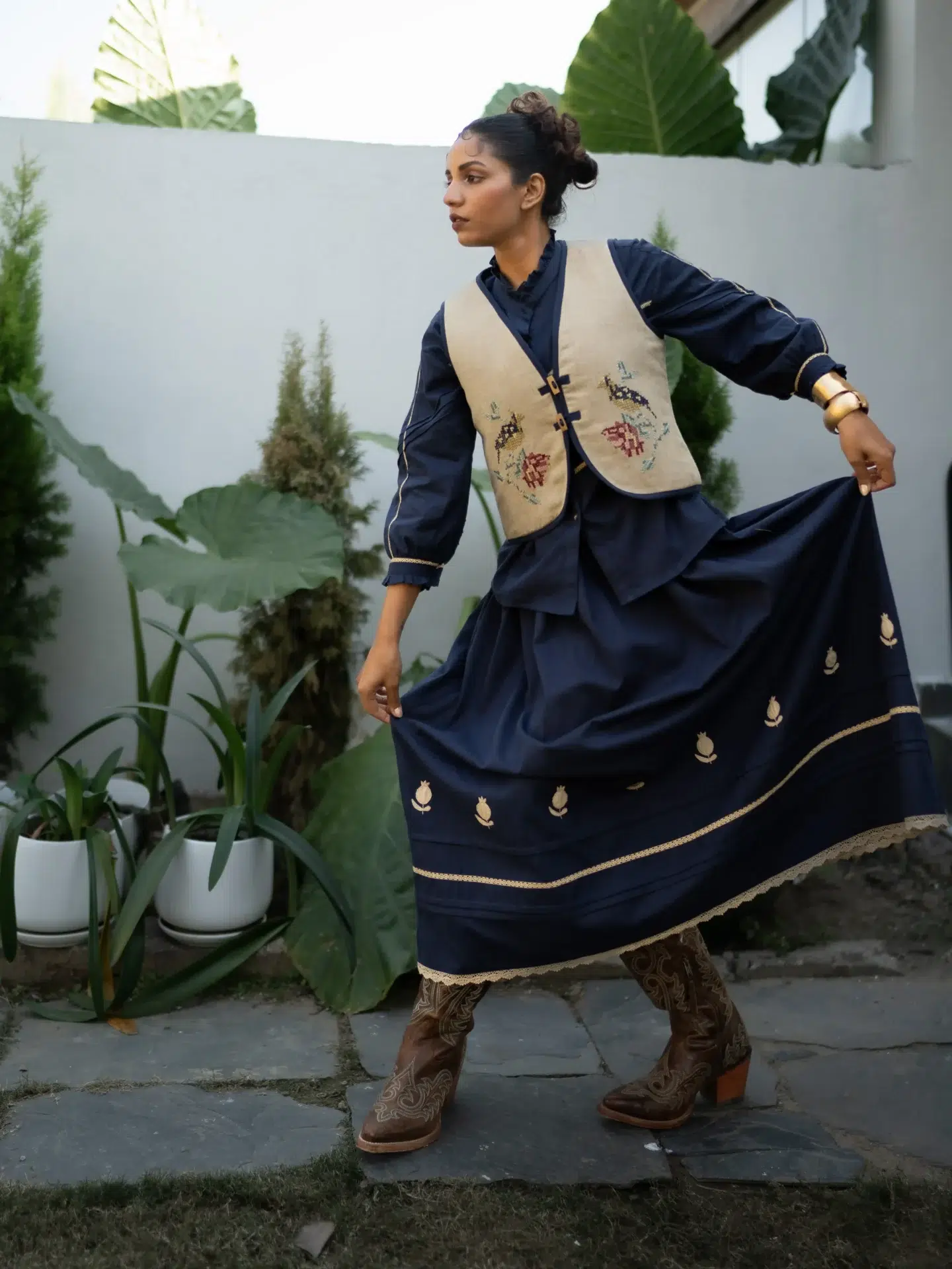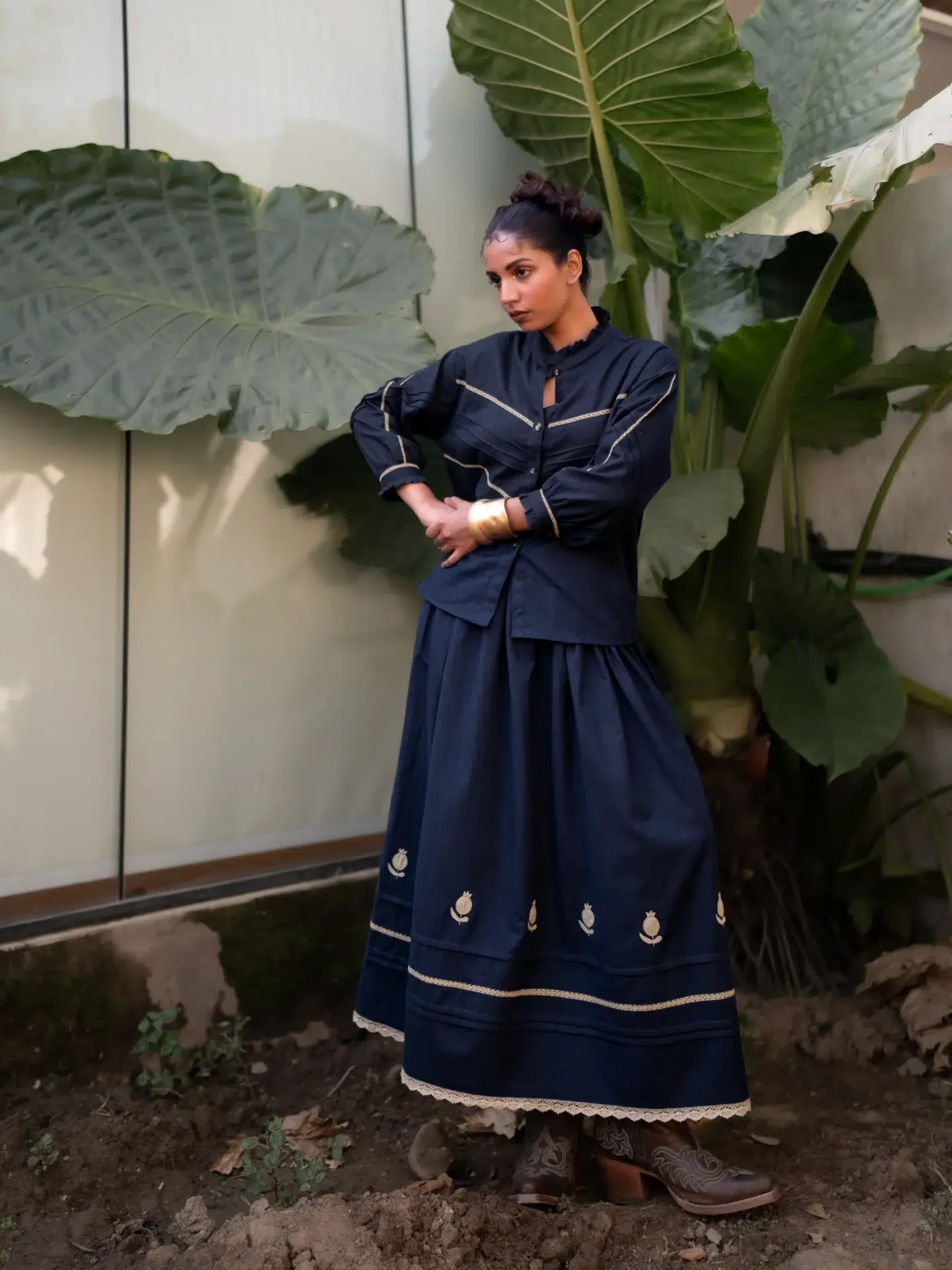 Crafted in breathable fabric, this navy skirt features intricate pomegranate appliqué and lace details at the hem. With soft pleats, a comfortable elasticated waist, and a full flared silhouette, it blends artisanal charm with effortless wearability.