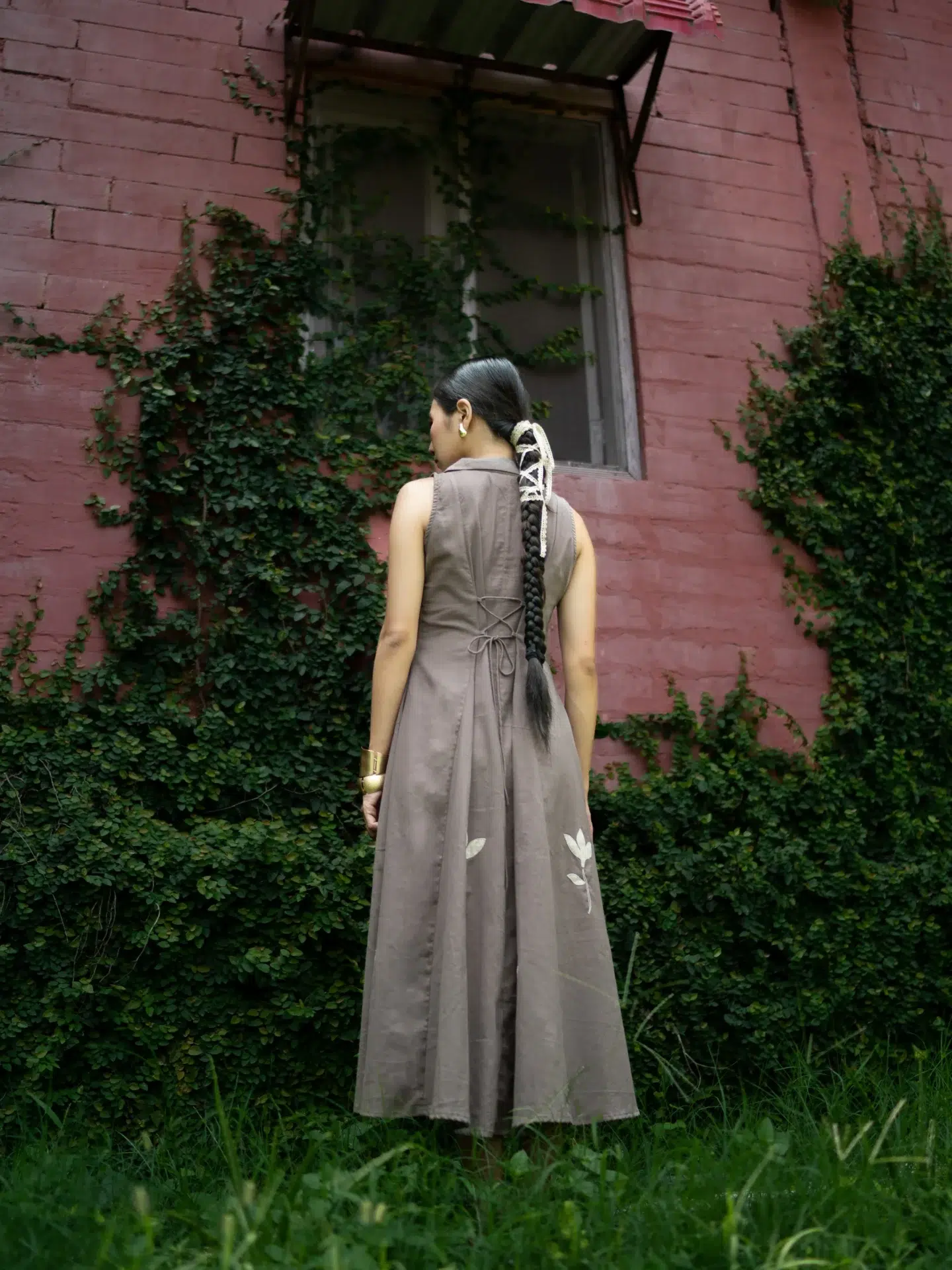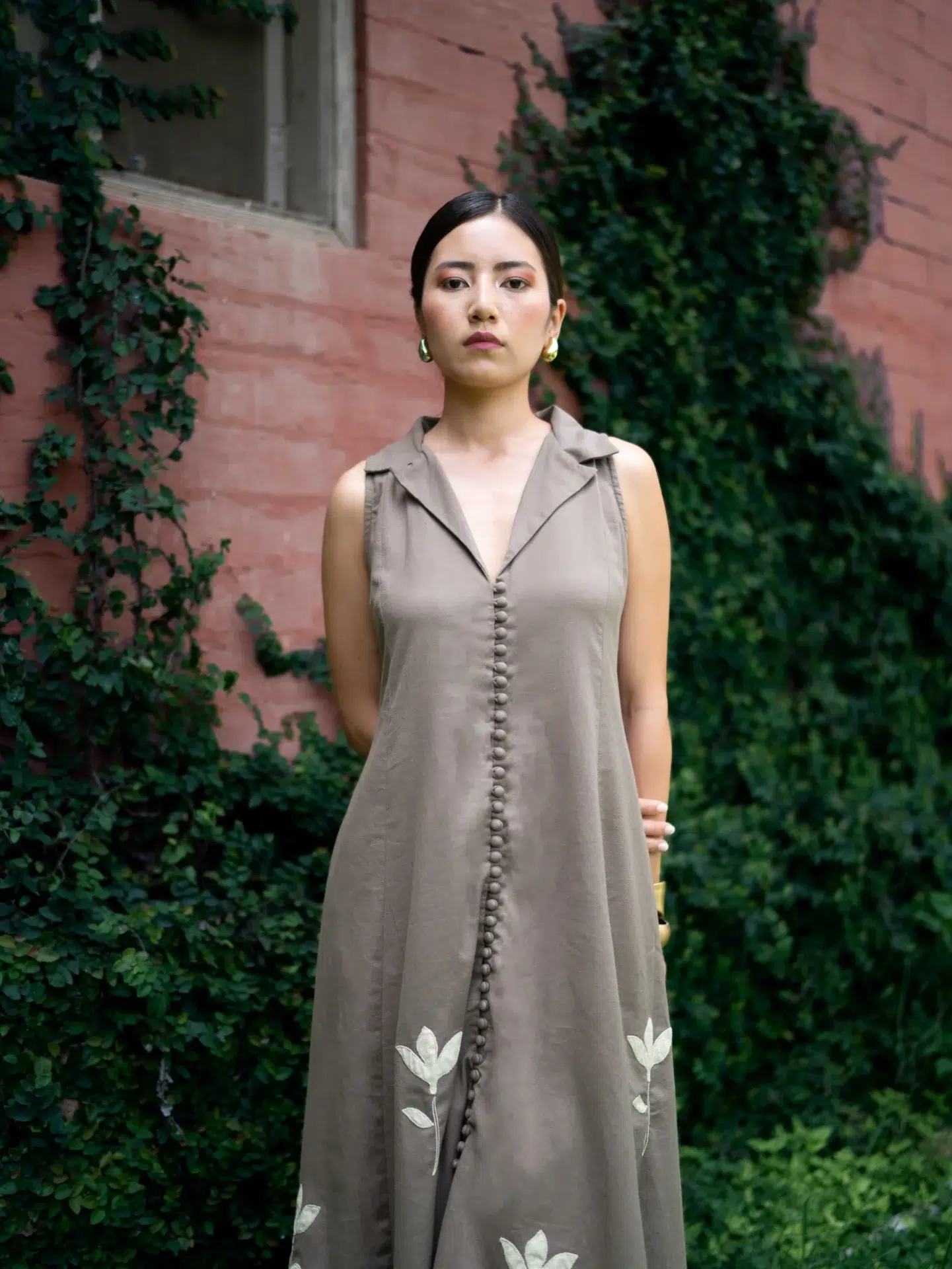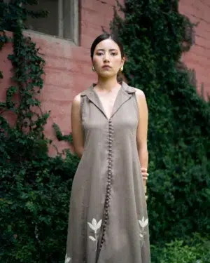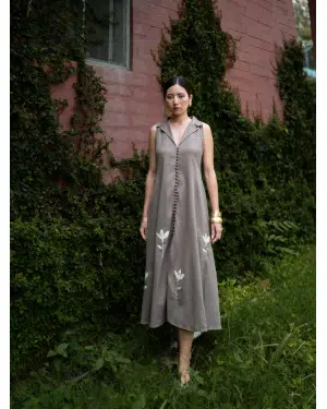 The sepia-grey dress is made from cotton fabric with all-over appliqué work. It features a front button opening and a collared neckline