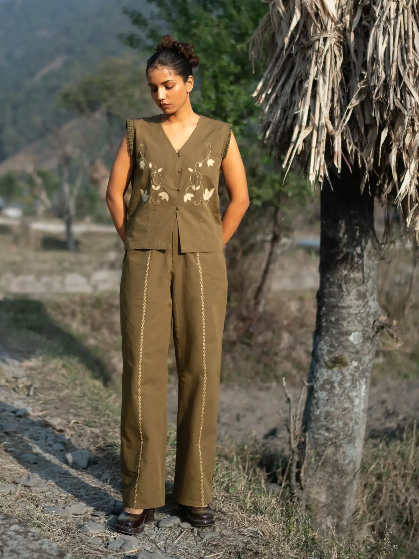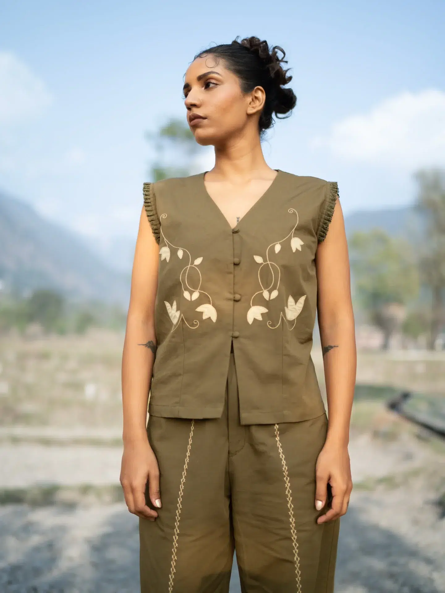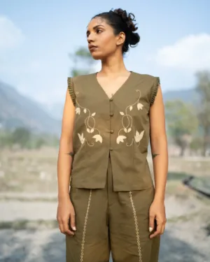 This V-neck hand embroidered vest top features artisanal handwork across the front, adding texture and charm. Style it with the coordinated piece to create a signature co-ord look that’s both modern and handcrafted.