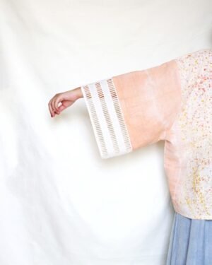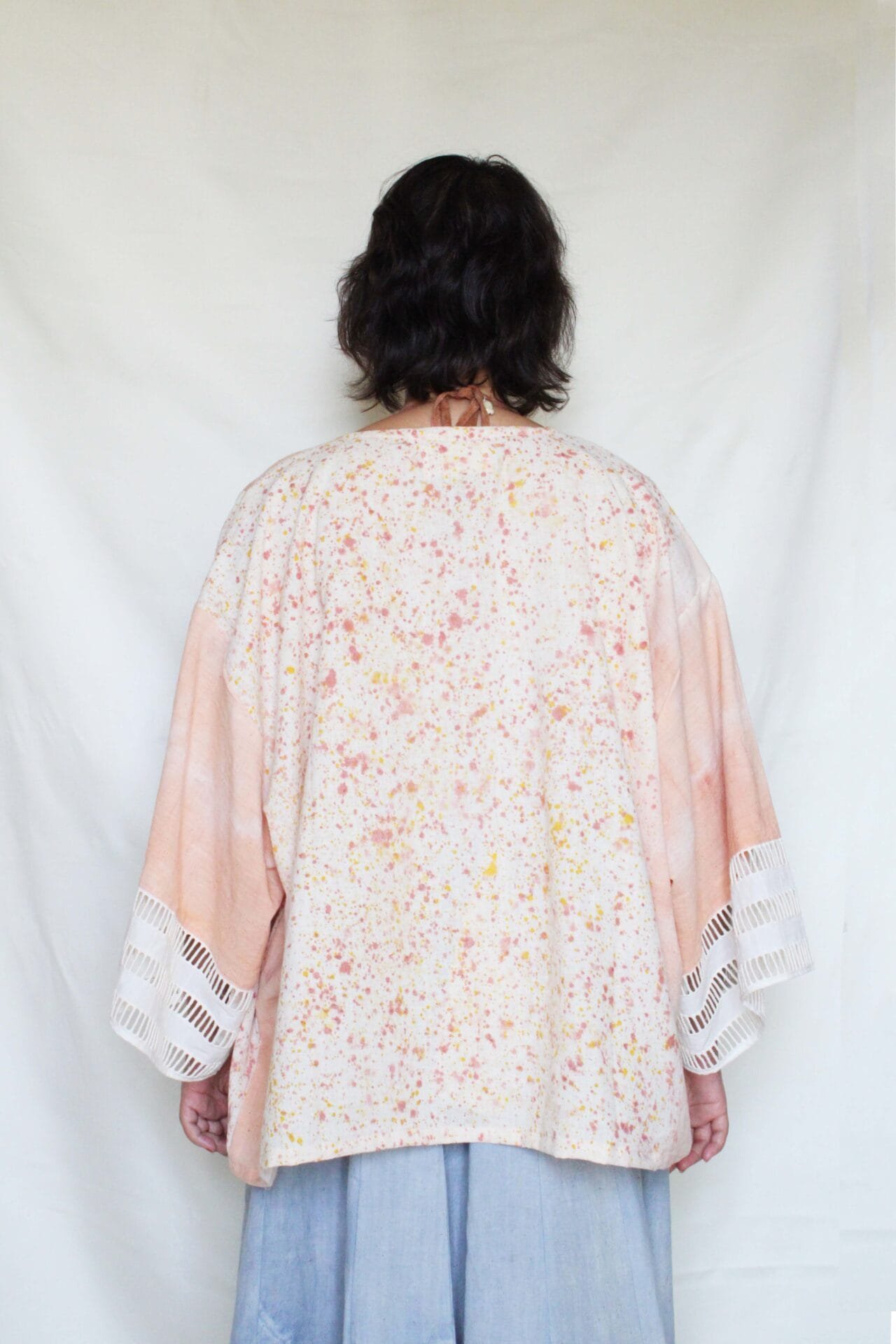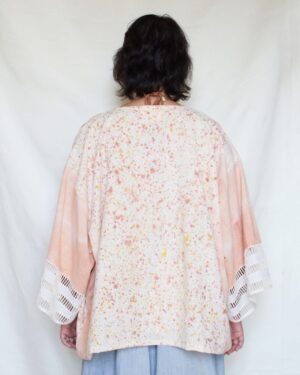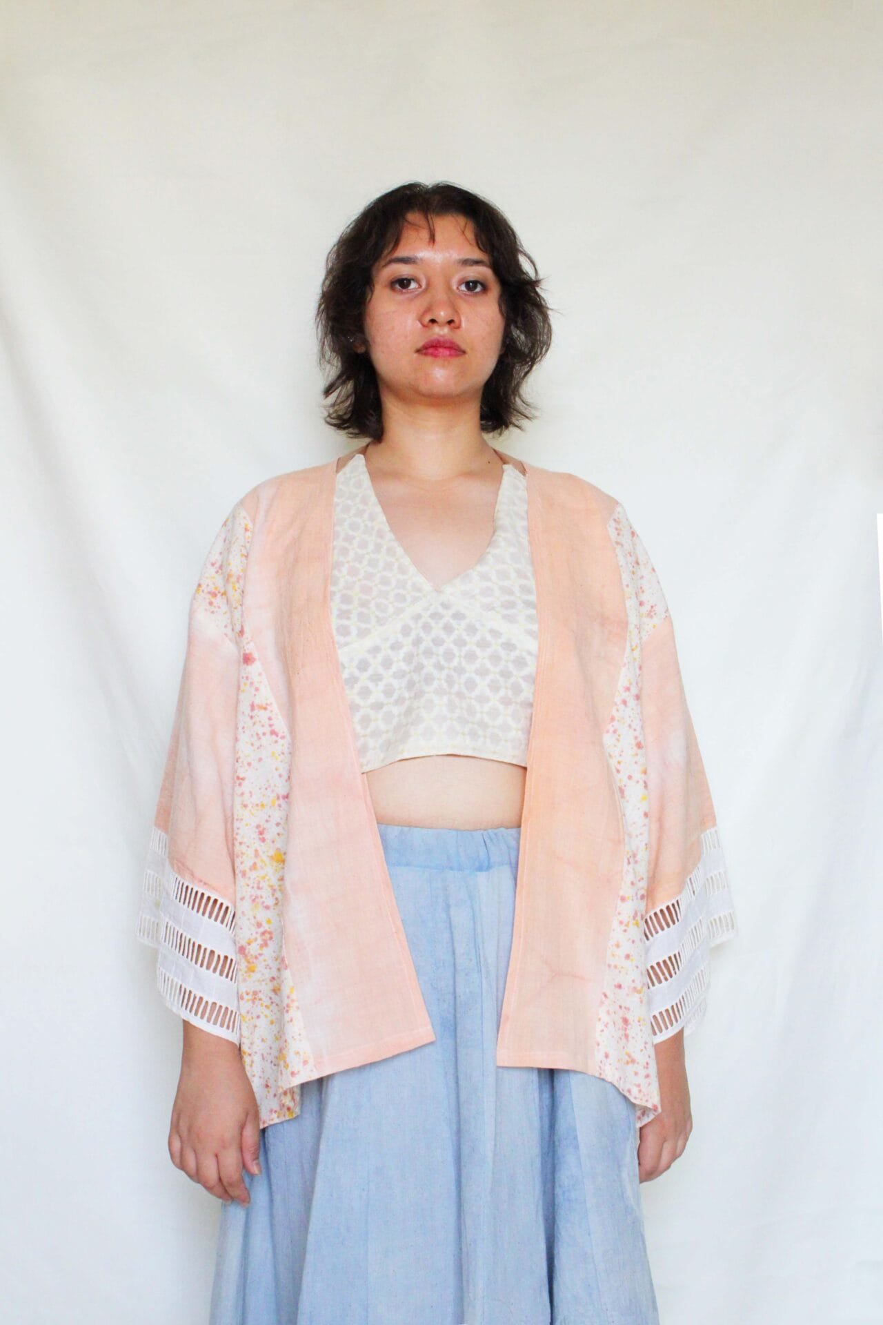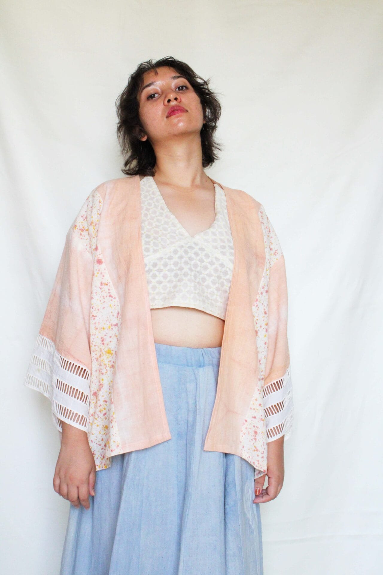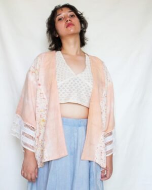 Bageeya's "Shakha" Breezy Jacket, made from Khadi Organic cotton by local artisans in Kutch, Gujarat. Dyed with sacred temple flowers and Ayurvedic herbs by our trained artisans, this jacket embodies mindful fashion. Catechu lend a beautiful, peach hue, while the flowy kimono-style silhouette offers effortless comfort across seasons. Detailed with delicate lace cuffs, this free-size jacket is a versatile addition to your conscious wardrobe. Woven from the finest organic khadi cotton, sourced directly from local weavers in Kutch, this jacket is a celebration of sustainable craftsmanship. We believe in minimizing our environmental impact, which is why we use natural dyes extracted from sacred temple flowers and Ayurvedic herbs. Catechu, a subtle peach. This unique dyeing process not only creates stunning colors but also reduces the harmful chemicals used in conventional textile dyeing, making a conscious choice for a cleaner planet. Inspired by the timeless elegance of the kimono, this Breezy