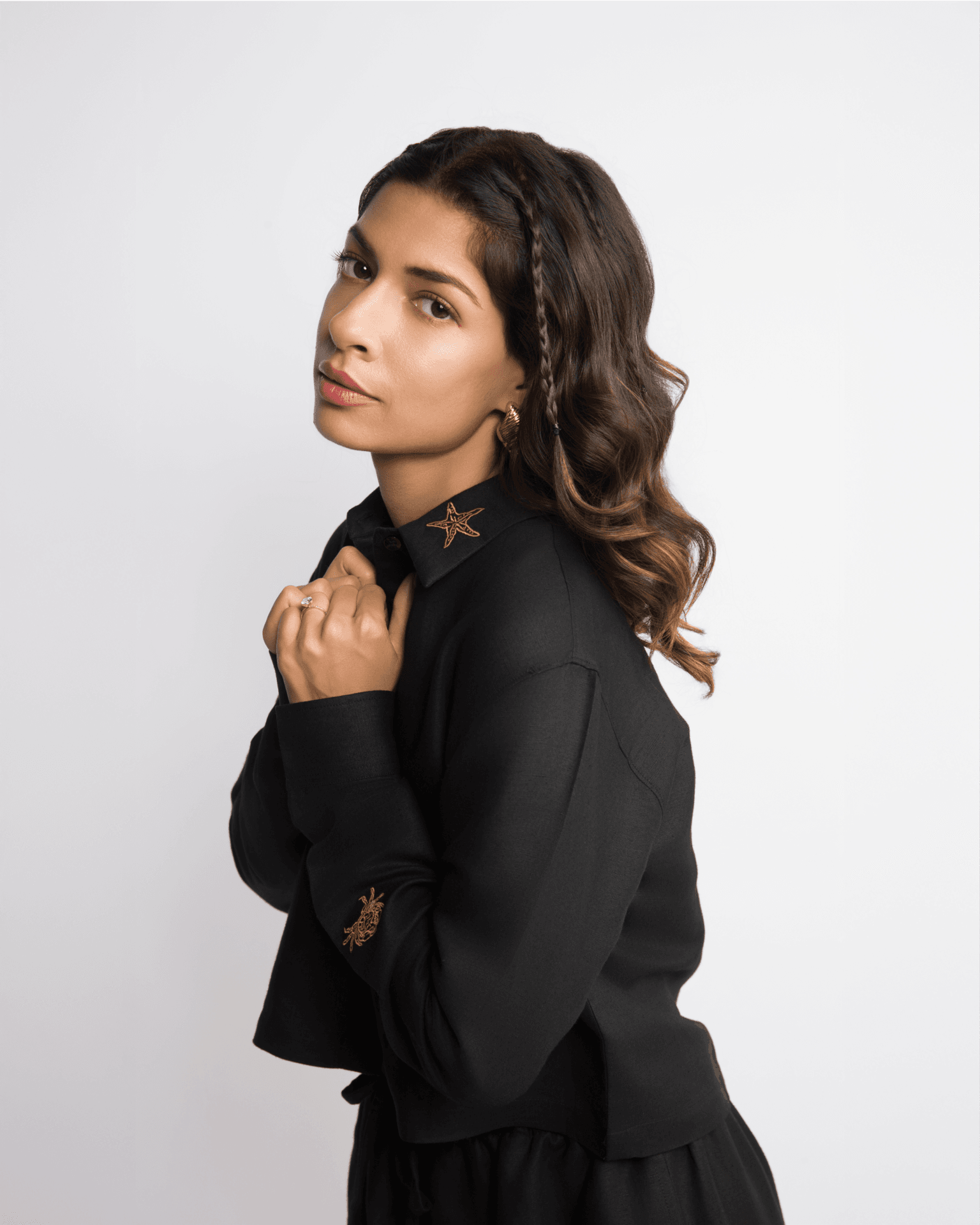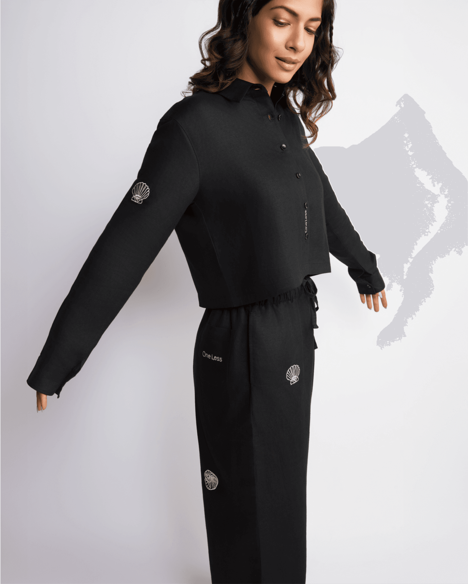Delicate marine motifs?shells, crabs, and starfish?are embroidered across the collar, sleeves, and waistline, with discreet One Less branding near the buttons. Each stitch is a quiet ode to summer and its oldest companion: the sea.