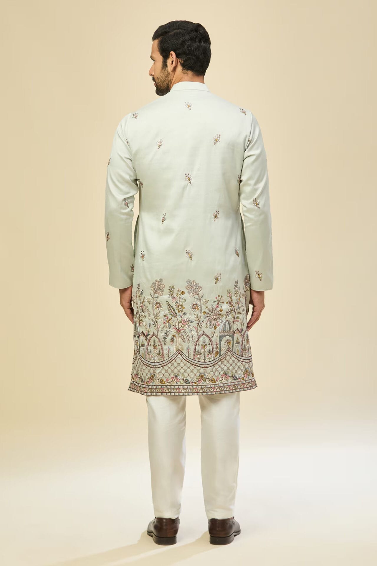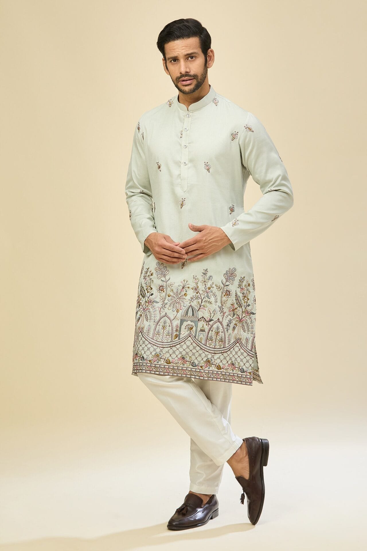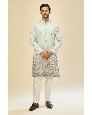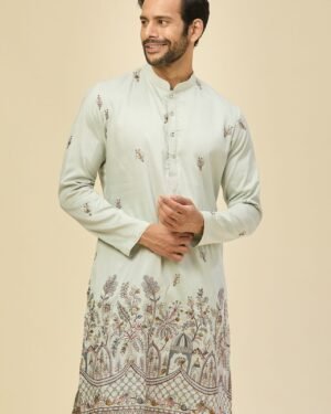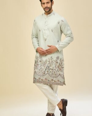 Sky Blue crepe silk based kurta enhanced with resham embroidery, paired with an off white dupion silk based mexican pants.
