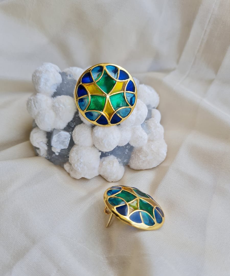 These Stud earrings are handcrafted in 92.5% silver, with thick gold plating. It has transparent enamel details in vibrant color & has a post and push back mechanism for easy wear. , Plating: Gold Plated, Metal Type: 92.5% Sterling Silver, Enamel / plating / gemstone: Transparent Enamel, Lock Mechanism: Post and push back, Measurement cm : 2.6 cm, Measurement inches: 1.02 inch , Care Instruction: Keep away from water, perfume and other liquids. Do not use any cleaning agents. Clean when storing in the provided pouches. Store them in moisture free areas and keep them away from water and liquid fragrances.