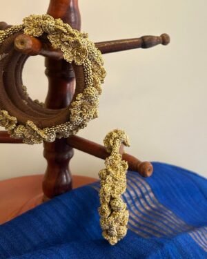 Lightweight and delicately crafted, these golden bangles are made over smooth rosewood bases, giving them a warm, earthy foundation. Each piece is adorned with fine crochet flowers, crochet beads, and golden seed beads ? tiny details shaped with patient hands, adding shimmer without the weight.