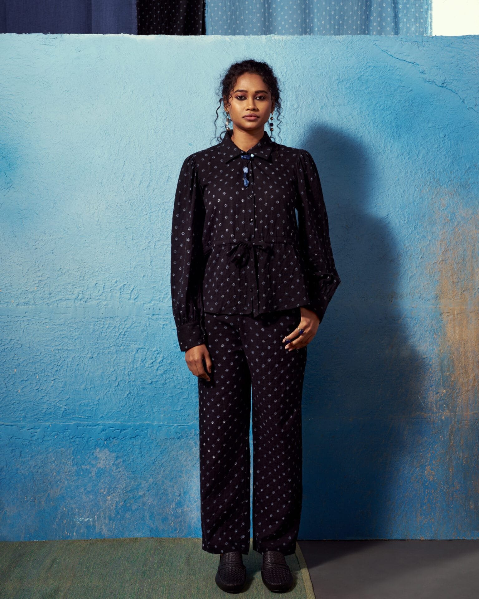 Crafted from breathable, lightweight cotton, the Tara Shirt features gathered puff long sleeves, a classic collar, and a front button-down design. A delicate waist tie cinches the silhouette, lending a flattering, feminine shape. Reimagining Bandhej in a tailored form, the Tara Shirt is crisp yet fluid, luminous yet grounded ? a timeless piece made versatile for every layer and look.