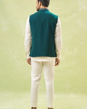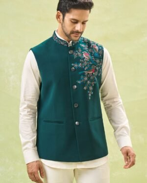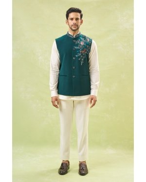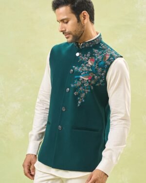 Teal Green Embroidered Nehru Jacket
